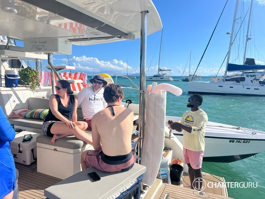 When Captain Richard is sailing the boat he is quite happy to have company sitting next to him at the helm as he explains the processes of sailing a 50 foot catamaran, whether it’s a short sail across Sir Francis Drake Channel on the first evening or a sunrise sail to Anegada. Shannon can show interested sailors how to anchor or how to hook a mooring ball. If you are not up for learning to sail, you can always relax on the beanbags on the tramp, sun up on the u-shaped couch on the flybridge, or read in a nice shady spot.
