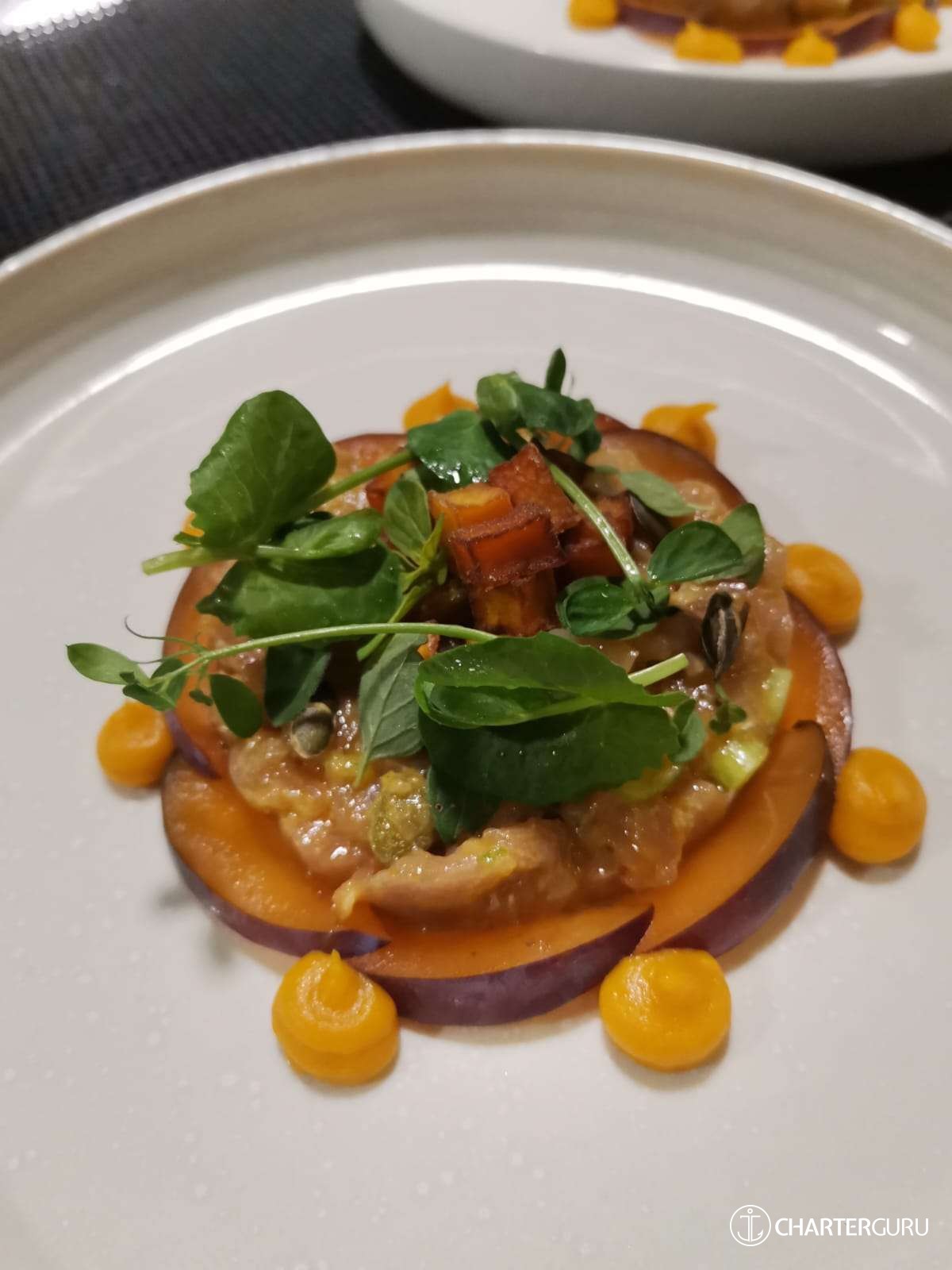 Includes boarding after 4pm, welcome cocktail and canapes plus a light breakfast the next morning. Dinner is to be taken ashore at client expense.