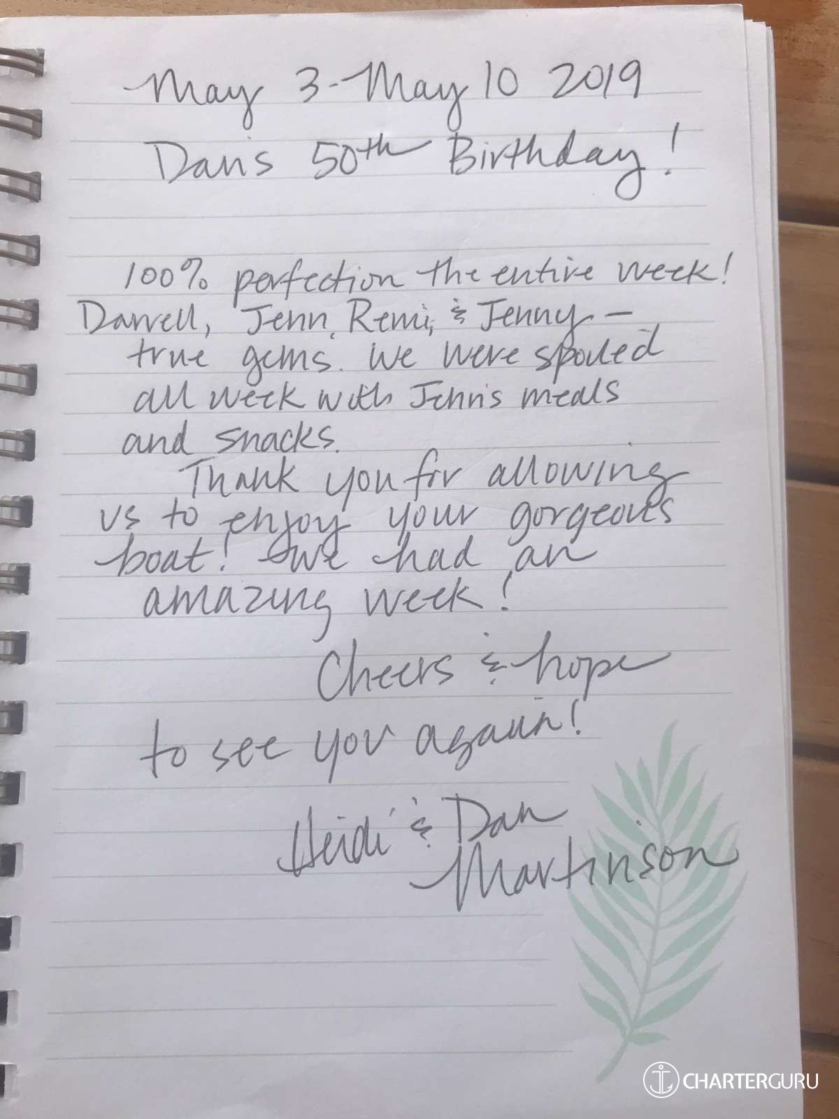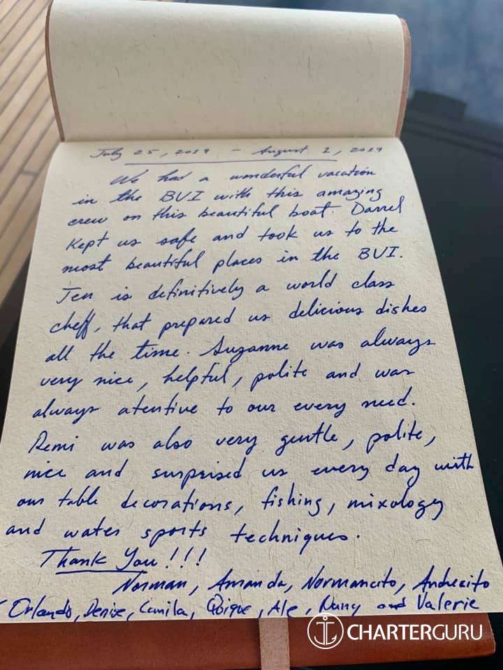 This was a family charter for guests with prior charter experience. Both the parents and the two boys thought the crew were phenomenal. They were all really in tune with the guests and understood what was needed, and not needed, to ensure they had exactly the type of service and experience they hoped. Jenn’s meals were spot on each time for the adults and the boys. She did everything perfectly. Jenny was everywhere taking care of them and the yacht. Remi was great with the boys and this was a very key element in everyone’s enjoyment. Scott had great praise for Darrel and the way he managed every aspect of the entire program. The charter experience was ideal for the family and this was due in large part to the way Darrel and Jenn paid attention to the guest preference notes and to the telephone comments. Operating a charter yacht under the current conditions is a challenging task for captains and crews. Darrel and his team pulled this one off in such a casual and yet professional and thorough manner that the guests were relaxed and at ease the entire charter.