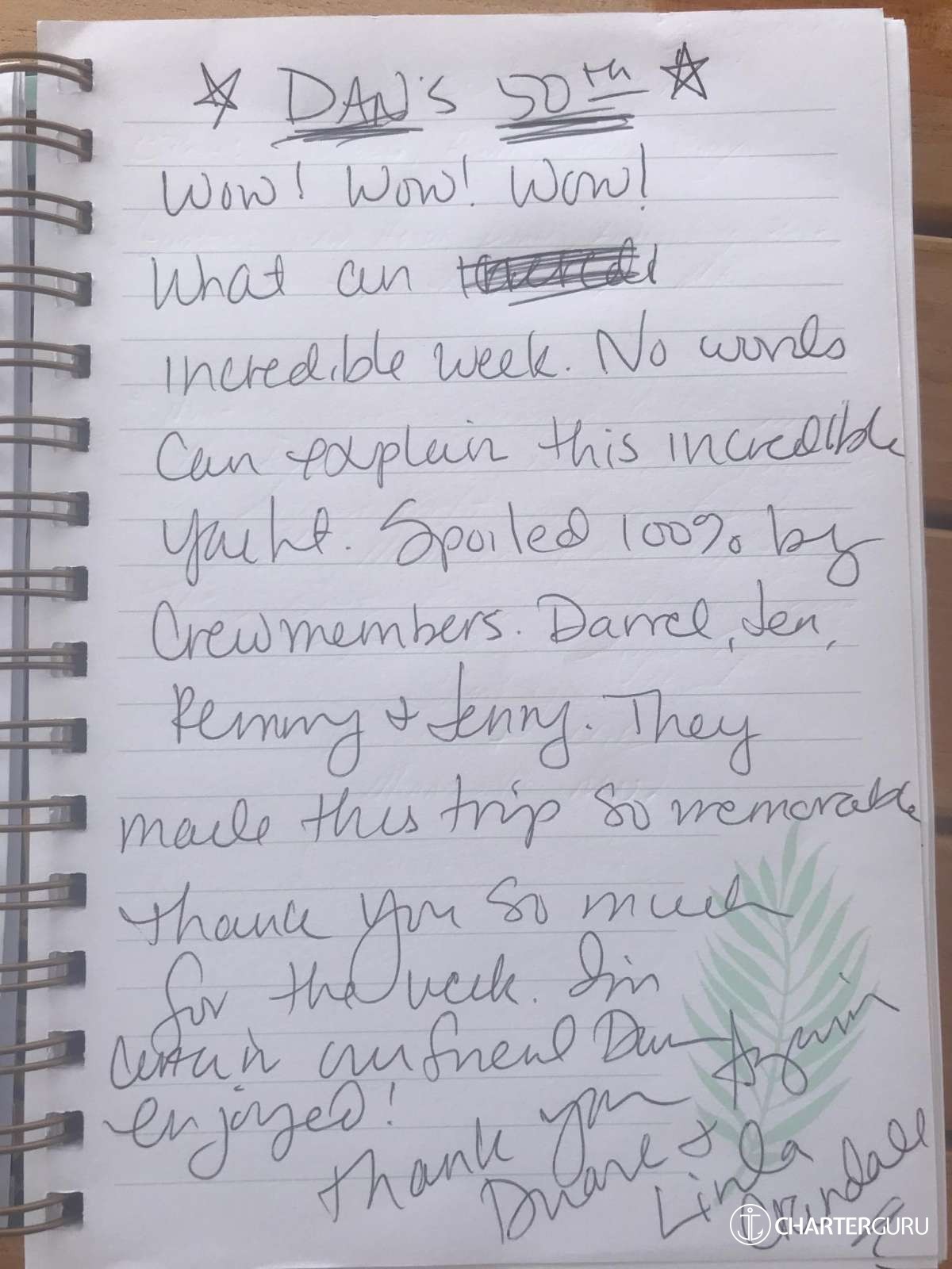A great indicator of a charter guest’s satisfaction is if they wish to return and if they recommend the yacht and crew to their friends. The Simons do want to return, and they are recommending ANGELEYES. From our perspective this is the best feedback we can have; the crew exceeded expectations and the clients could not be happier. From the operational side we were extremely pleased with every aspect of Darrel’s execution of the charter.