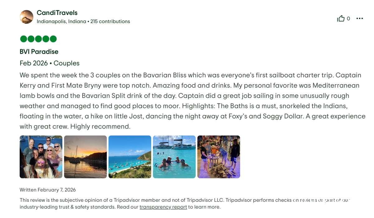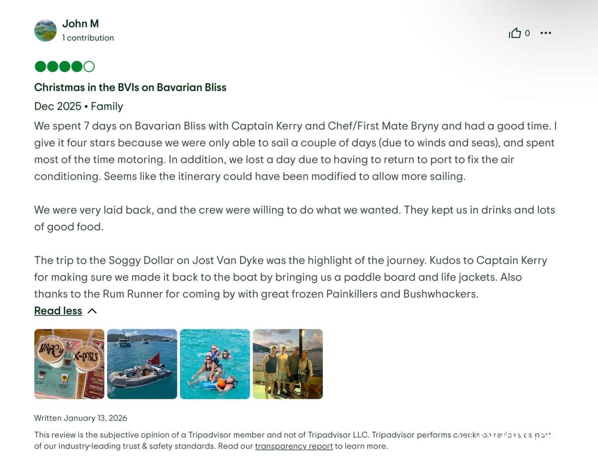 I highly recommend the Bavarian Bliss and the duo of Captain Kerry and Chef Bryny for any future sailing trips.