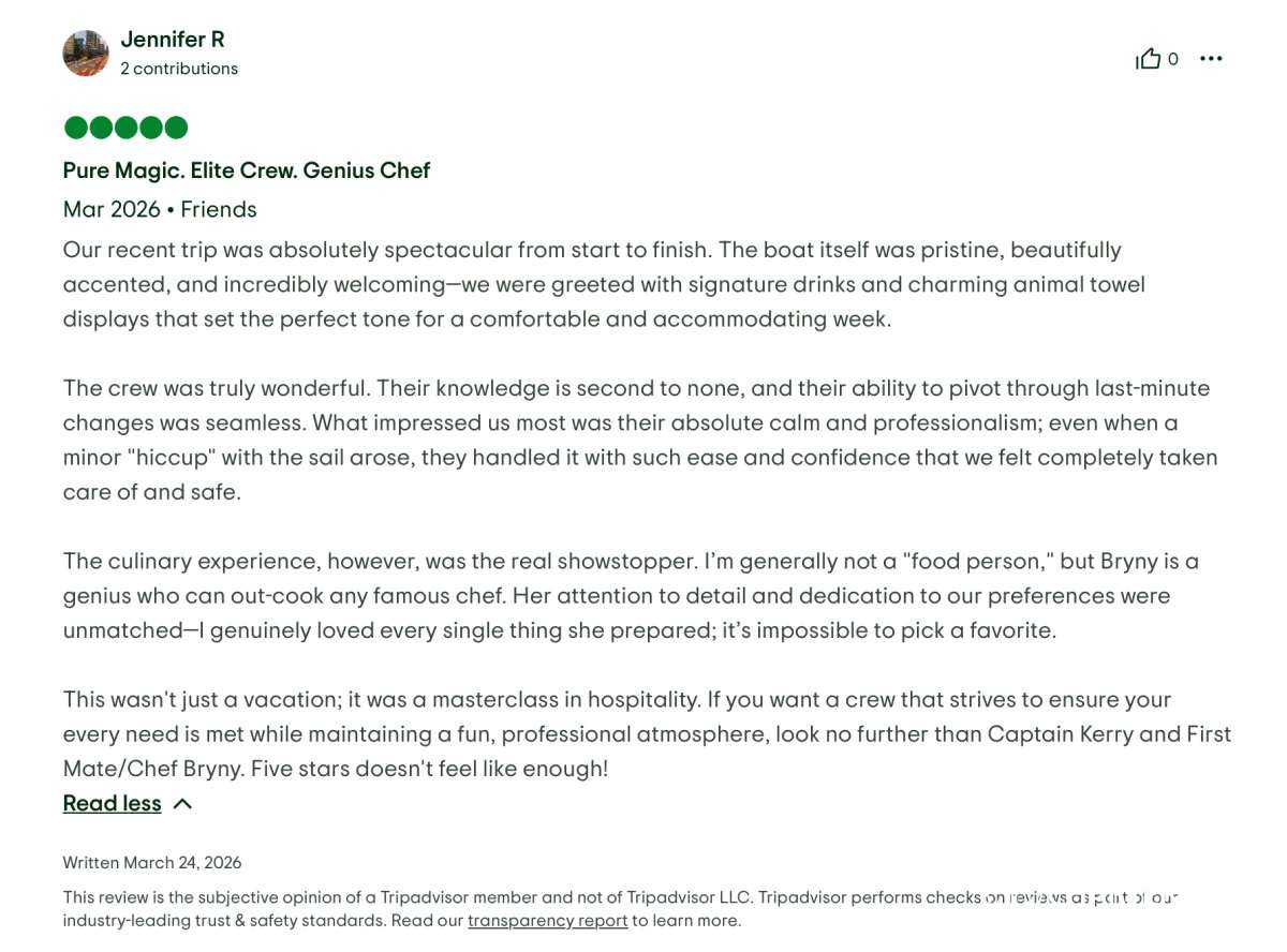 This wasn't just a vacation; it was a masterclass in hospitality. If you want a crew that strives to ensure your every need is met while maintaining a fun, professional atmosphere, look no further than Captain Kerry and First Mate/Chef Bryny. Five stars doesn't feel like enough!