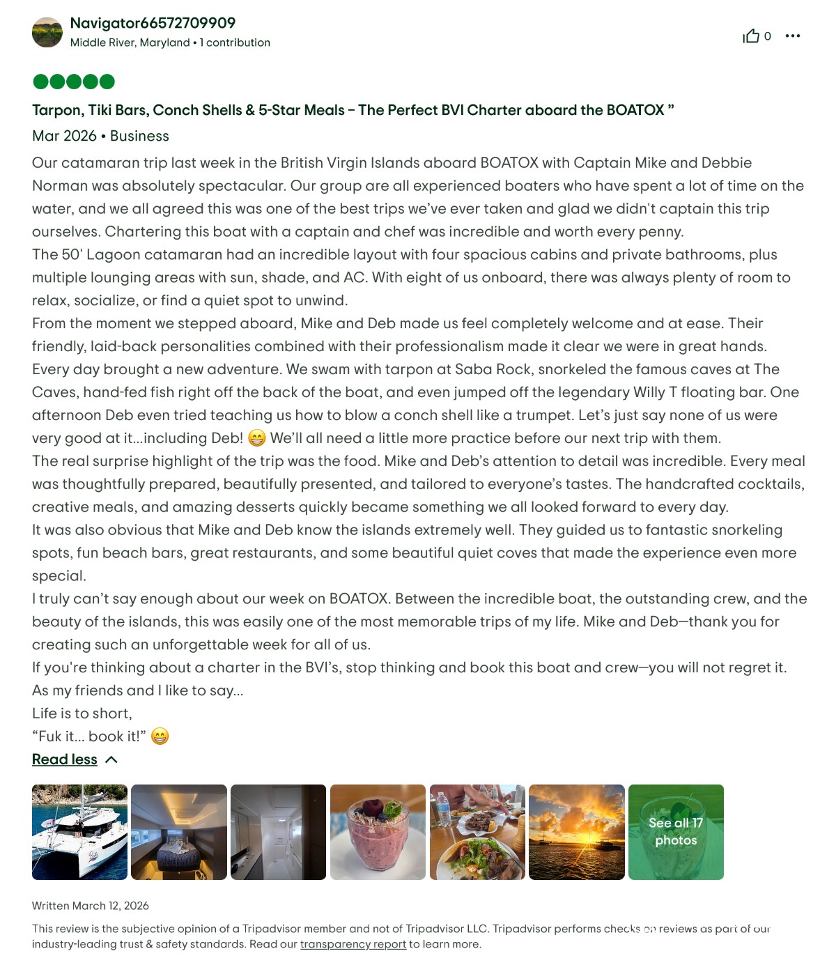 We would not hesitate for a moment to book another trip with them in the future — in fact, we’re already dreaming about it. If you’re considering a BVI catamaran charter, Boatox with Captain Mike and Chef Debbie is exceptional in every way. This is the kind of experience that stays with you long after you return home.