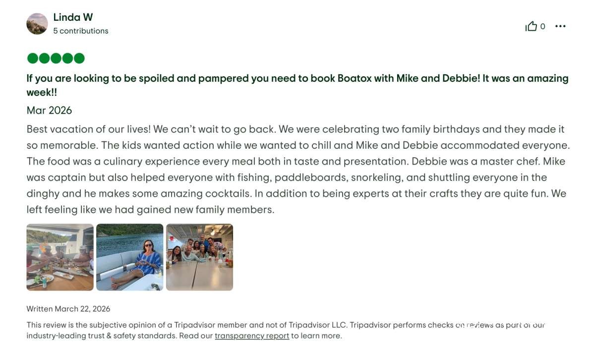 I truly can't say enough about our week on BOATOX. Between the incredible boat, the outstanding crew, and the beauty of the islands, this was easily one of the most memorable trips of my life. Mike and Deb-thank you for creating such an unforgettable week for all of us.