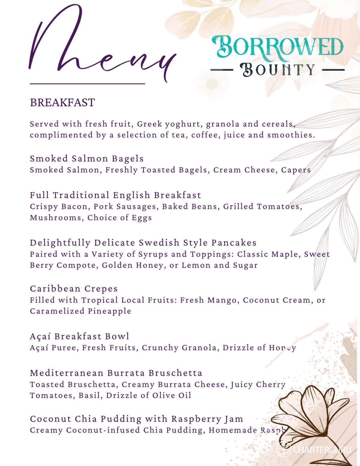 Inclusive charters are crewed charters with minimum or no additional charges. Provisioning, fuel and crew are included in the price. Additional fees may include diving, premium alcohol, local taxes, or onshore activities. These vary from yacht to yacht, please inquire.BORROWED BOUNTY Yacht Charter Price