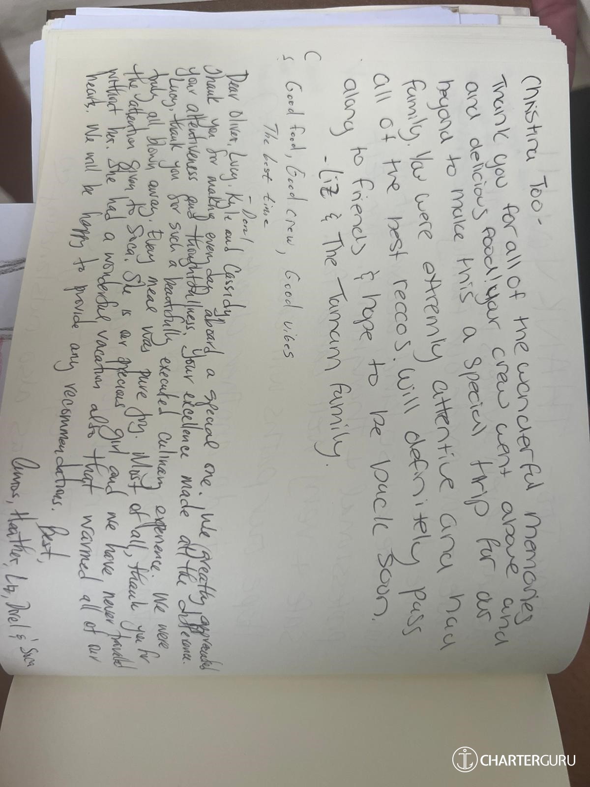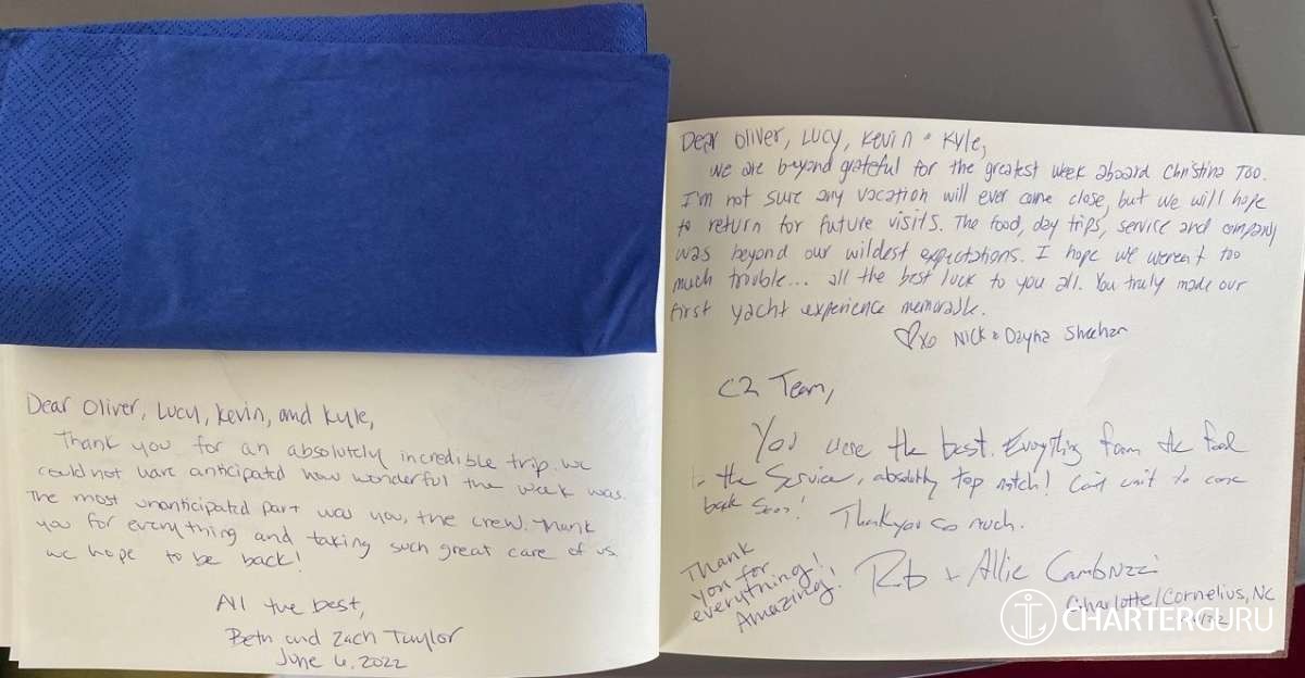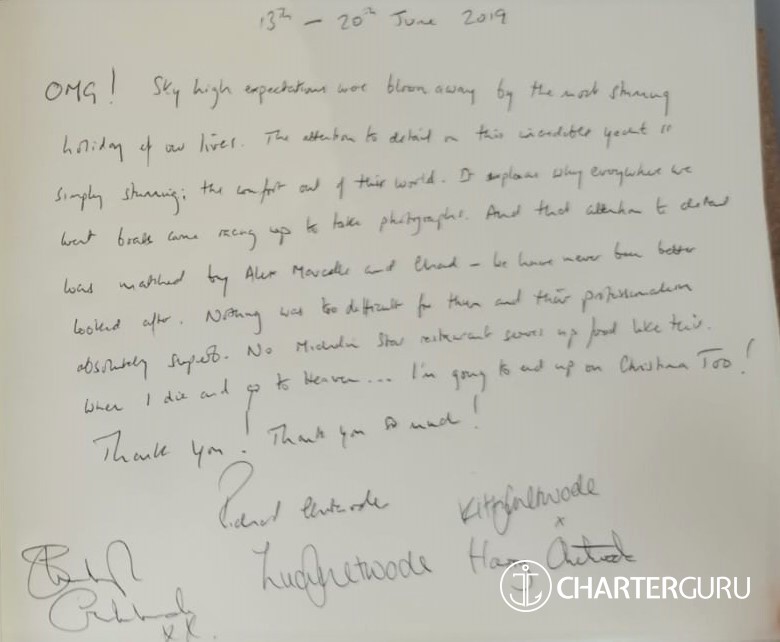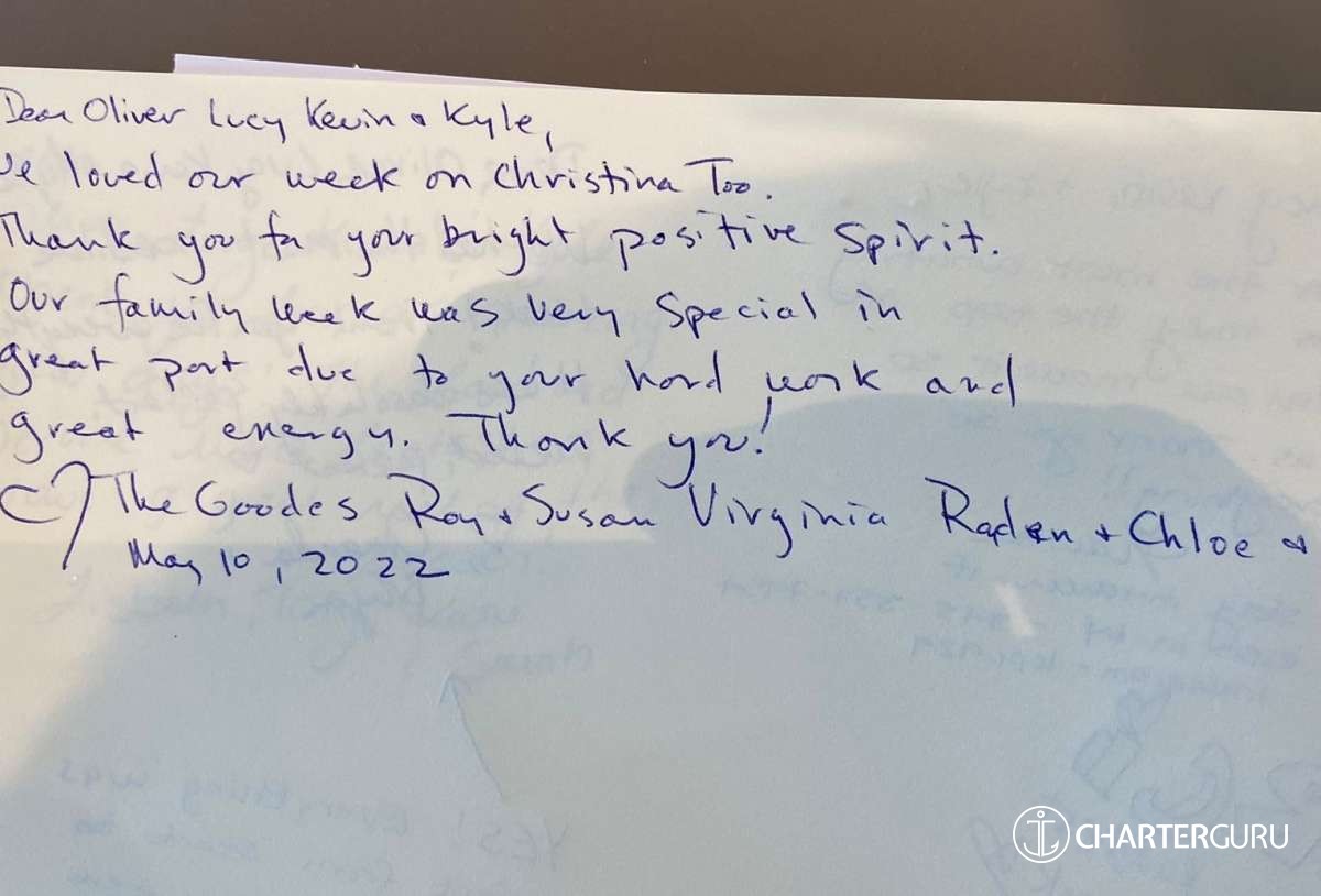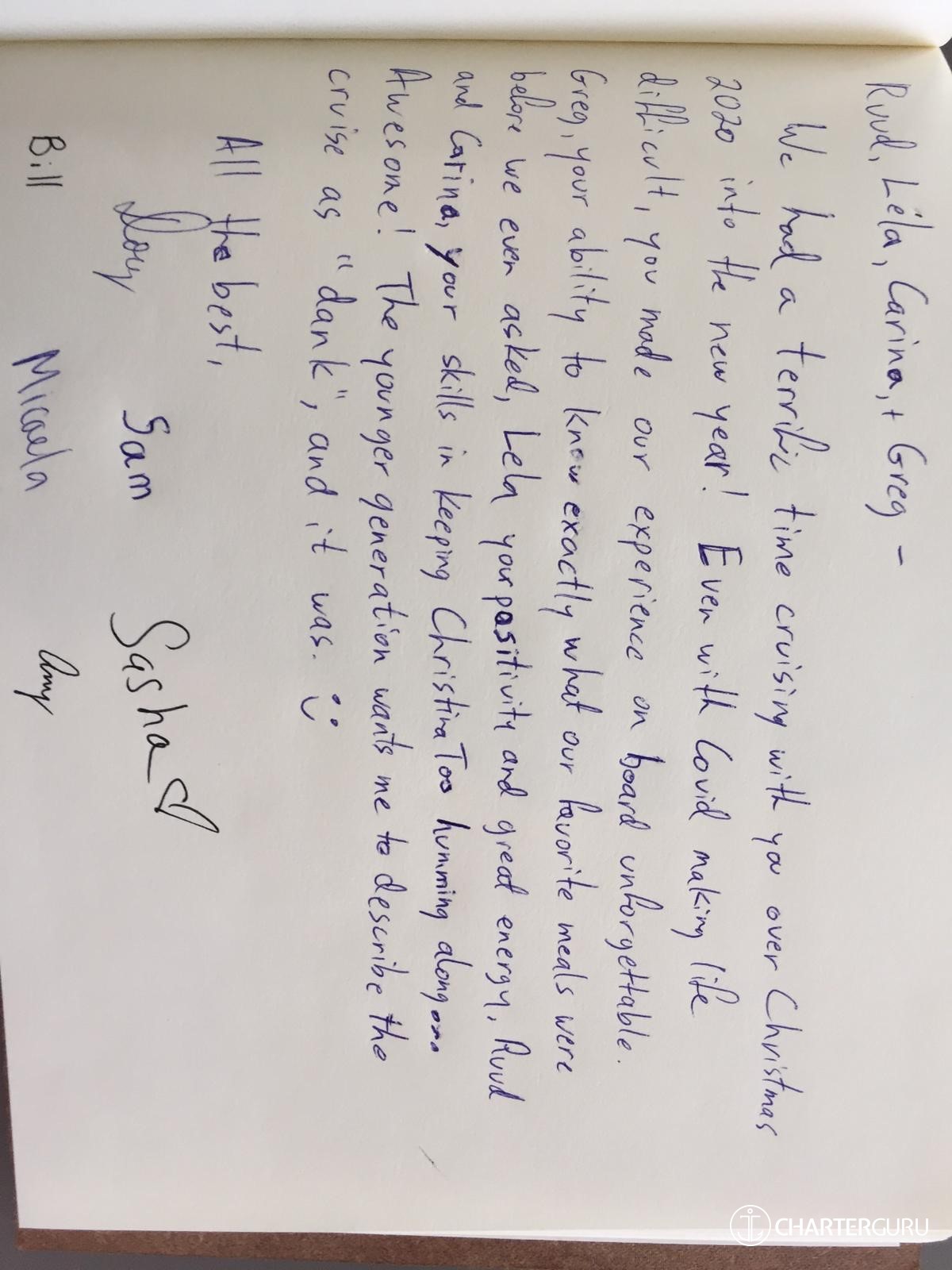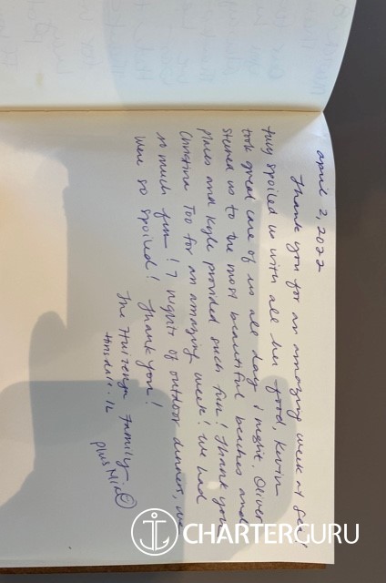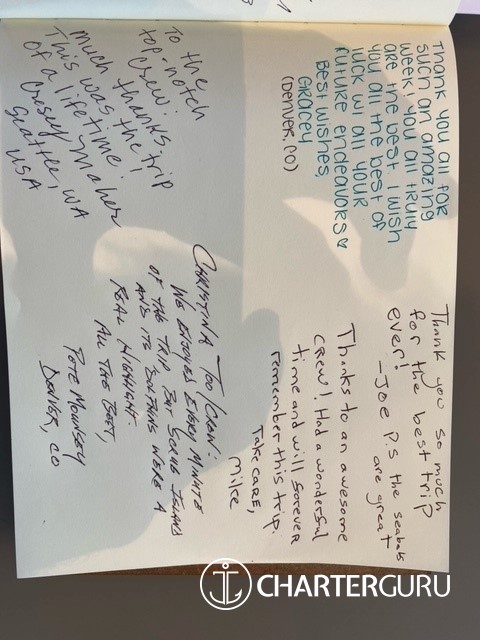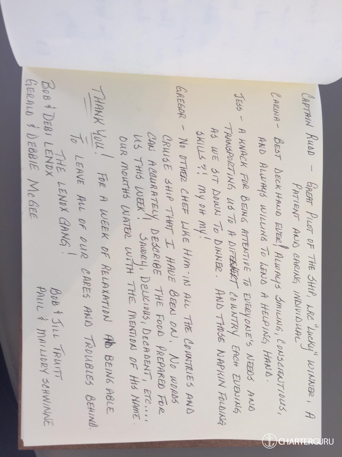 We could not have wishing you for better crew and thoughly enjoyed our time with you.