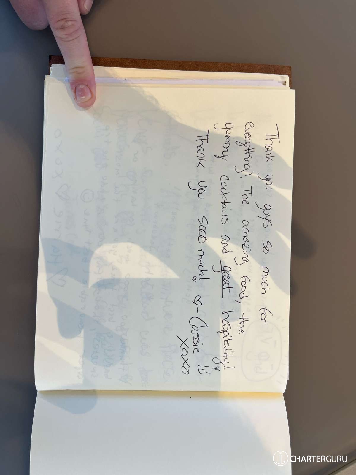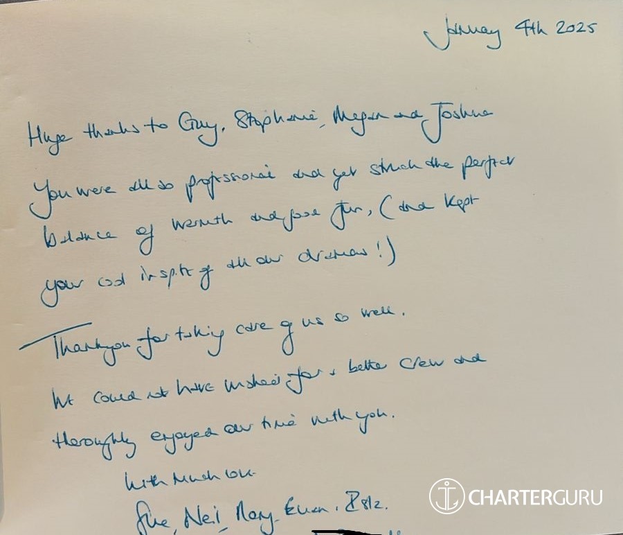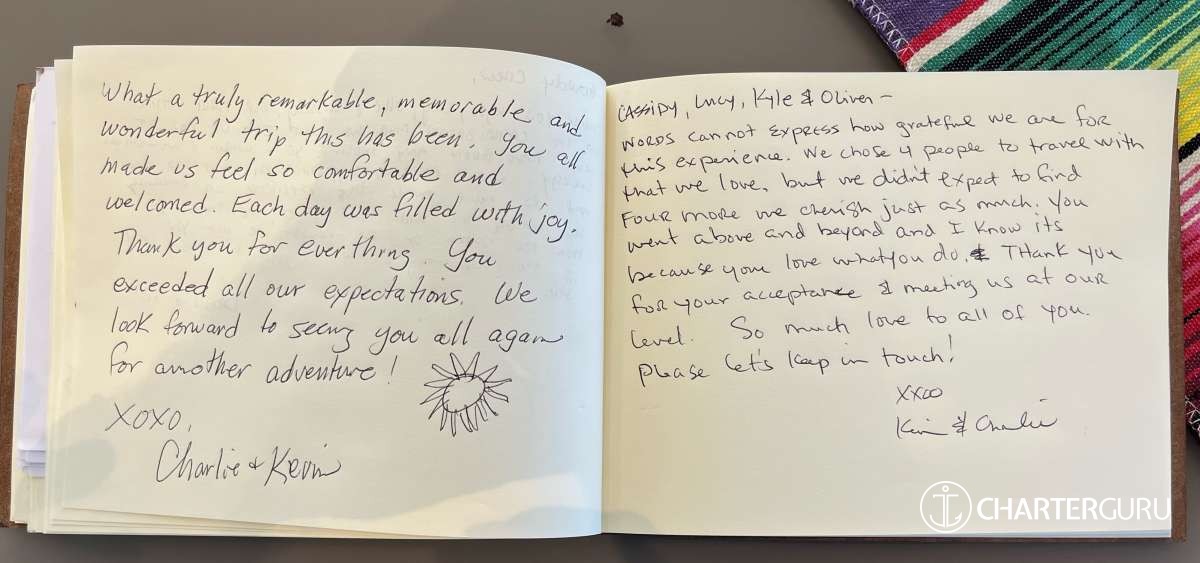 Thank you for an absolutely incredible trip. We could not have anticipated how wonderful the week was. The most unanticipated part was you, the crew. Thank you for everything and taking such great care of us. We hope to be back. All the best!