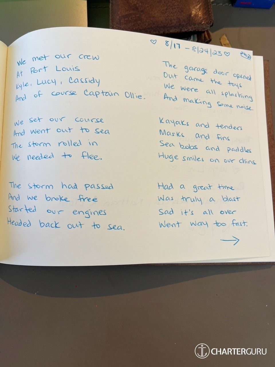 I have a call set up for next week with A. from the charter company and will let her know what a joy spending the last week and a half with you all was.