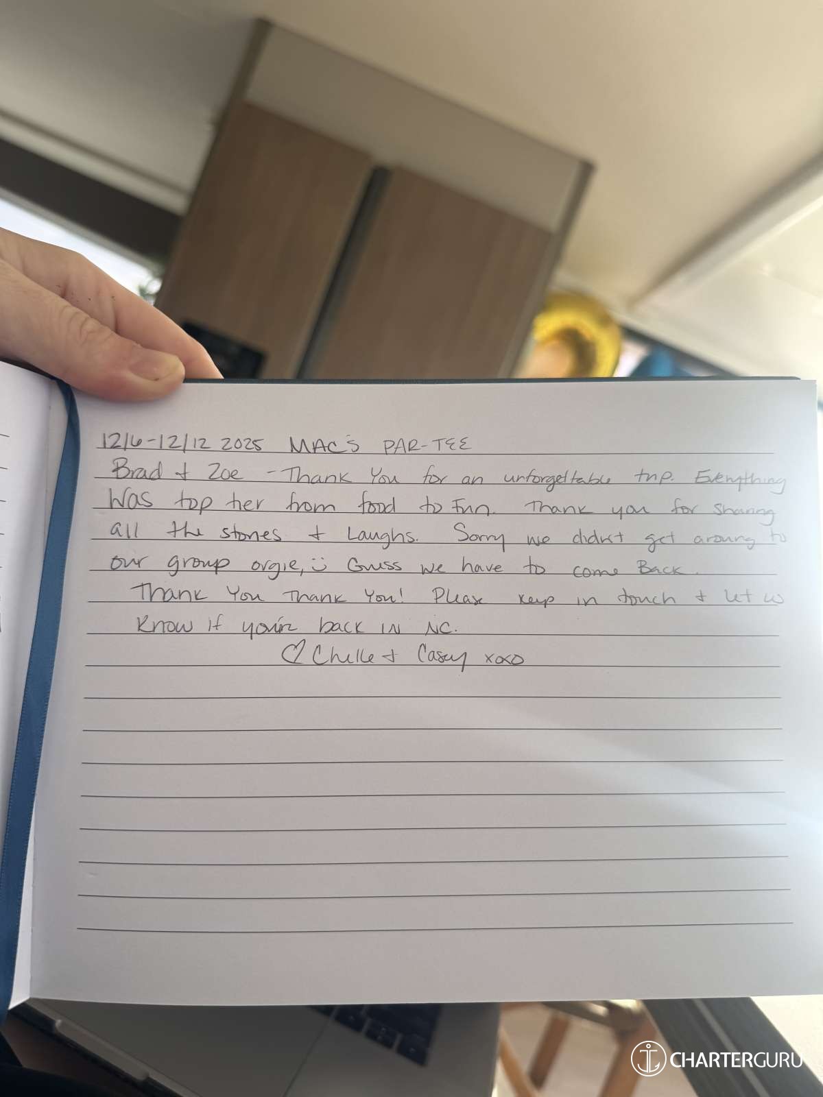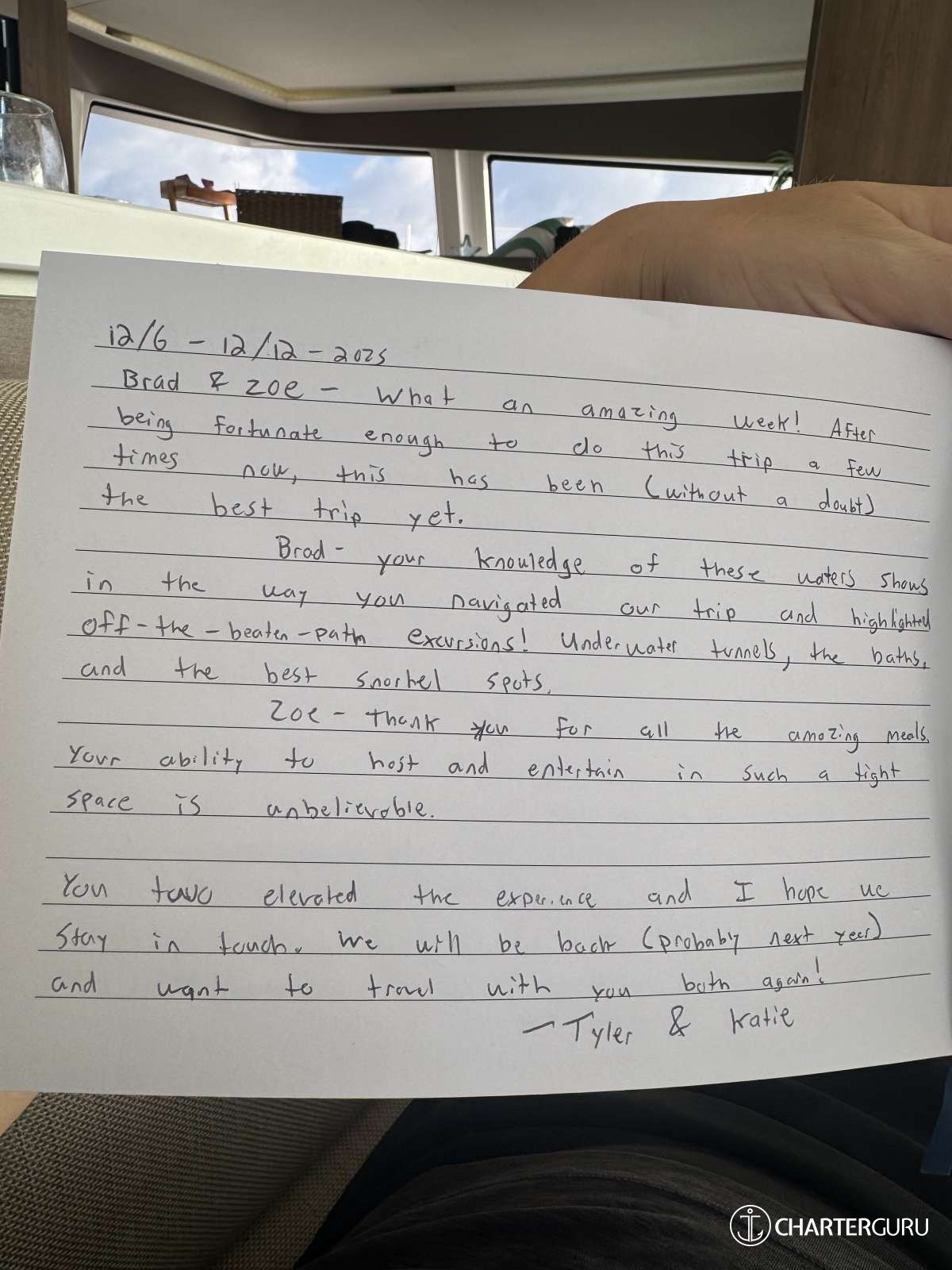 This has been a vacation to remember! You have been the most gracious, kind, thoughtful, hardworking and fun hosts. You have infected us with your love of sailing and the Virgin Islands, and it will be very hard to return here with anyone else than you. In fact, it is extremely hard to go back to New York without Zoe’s Michelin Star cuisine, Brad’s cocktails, your great company and the considerate itinerary and the attention to EVERY DETAIL. The information we got when booking does not even come close to the five-star experience that awaited us. Fair winds and following seas! Always!