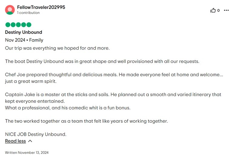 Captain Jake and Chef Joe were out of this world amazing! We had so much fun. We were so spoiled and cared for. We never had fear of safety, weather or water. All decisions Captain Jake made were on our behalf (as well as theirs), but for our enjoyment to see everything as weather permitted. A lovely sail it was. Chef Joe always had sweet flavor aromas coming from the galley. Our meals, 3 a day, were family style, gourmet, mouth watering, fat cat happy meals. We had great pleasure watching Chef Joe, as he had great pleasure in the food preparations. Gaining 6 pounds was pure delight! As a team, Jake & Joe enjoyed working together and the yacht ran smooth sailing.