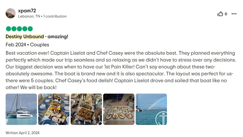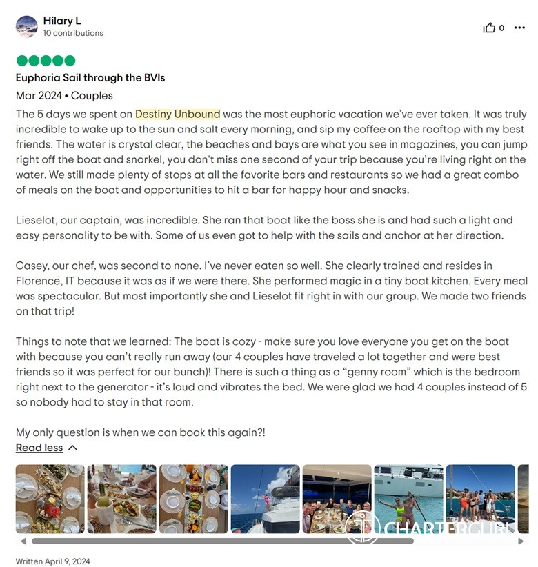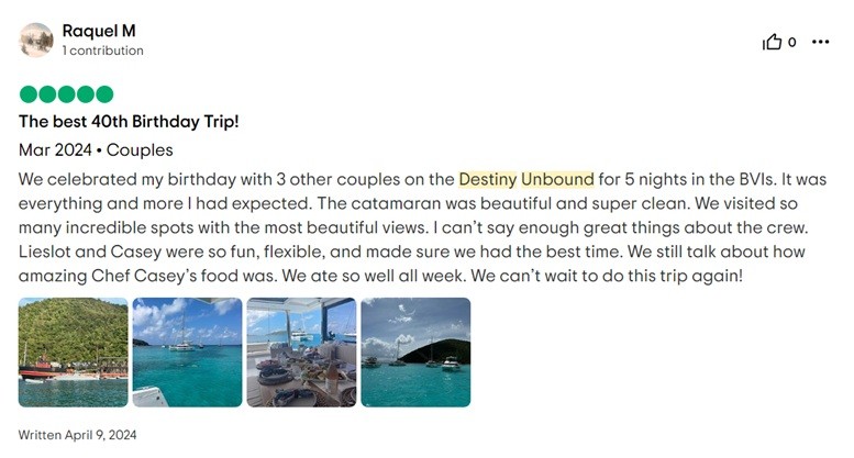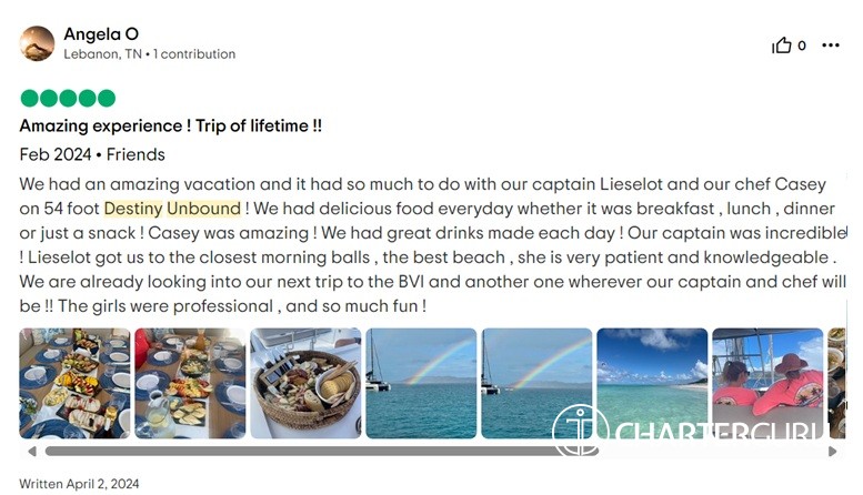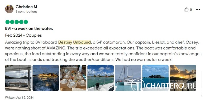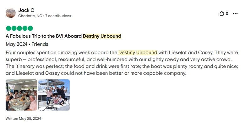 Loved all the islands, beaches, bars and sights of the BVI, but the thrill of the trip was the Destiny Unbound and it's crew. A very comfortable catamaran. With 5 couples plus crew, we worried about 'close quarters' and 'no private space', but it was never an issue. There is so much room on the Bali 54 Destiny Unbound!!
