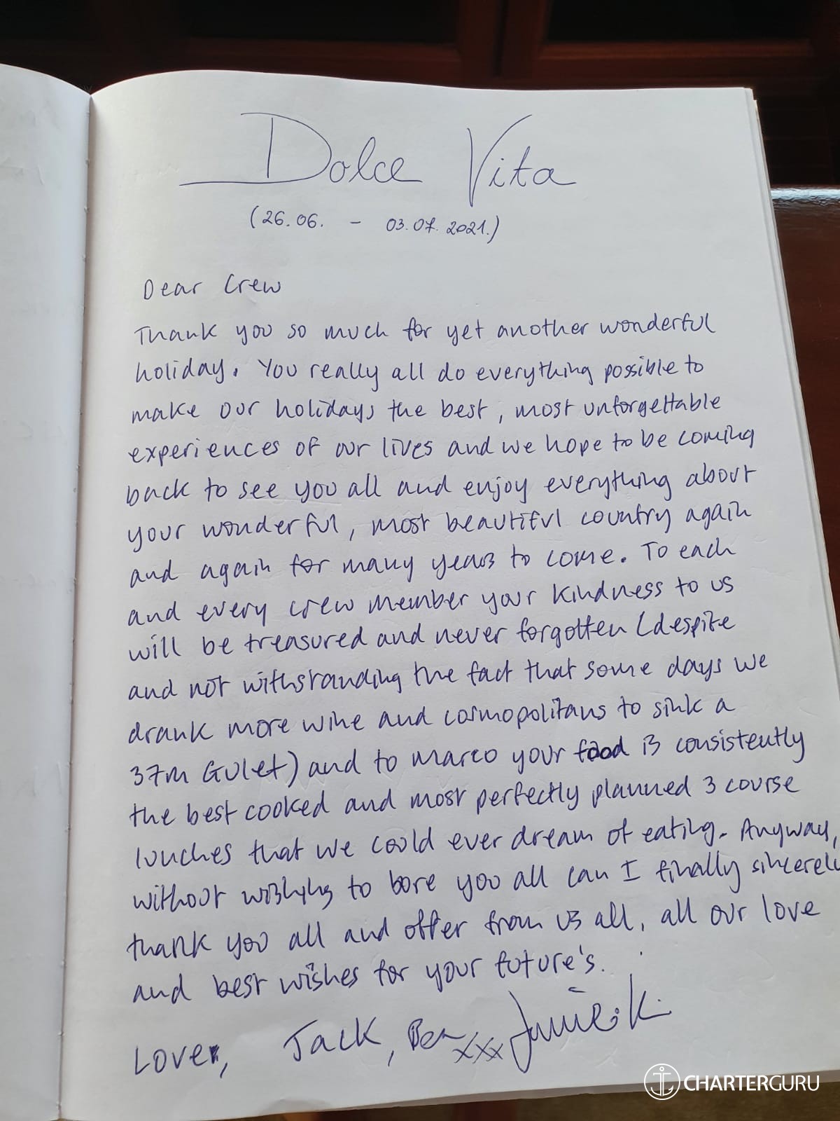 June 2023 Client review: 'This was our 2nd consecutive year chartering the Dolce Vita; all new crew, longer stay and extra stops and locations. New highlights include the waterpark beach in Makarska (be sure to eat at Tempera Street Food in Makarska!), a fantastic e-bike ride through Mljet National Park and some sunrise(ish) walks along the board walks.