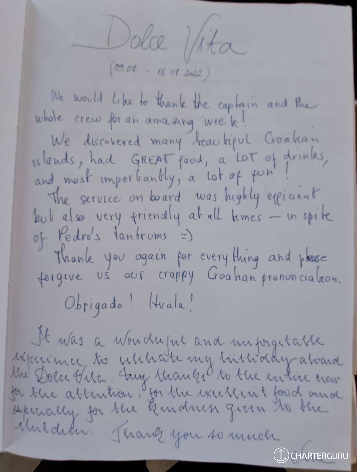 DOLCE VITA is one of the most beautiful gulets based on the Adriatic. Our confidence in this statement is backed not only by our own experiences but also by the kind words of our guests. They often highlight the attentive crew, spacious deck, and comfortable accommodations.