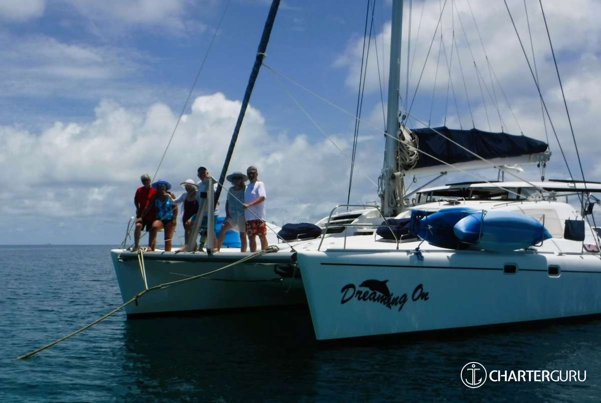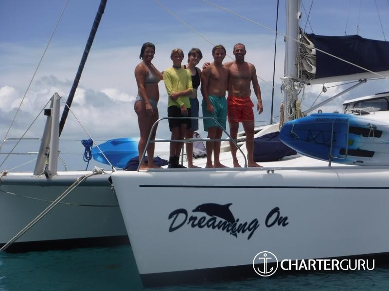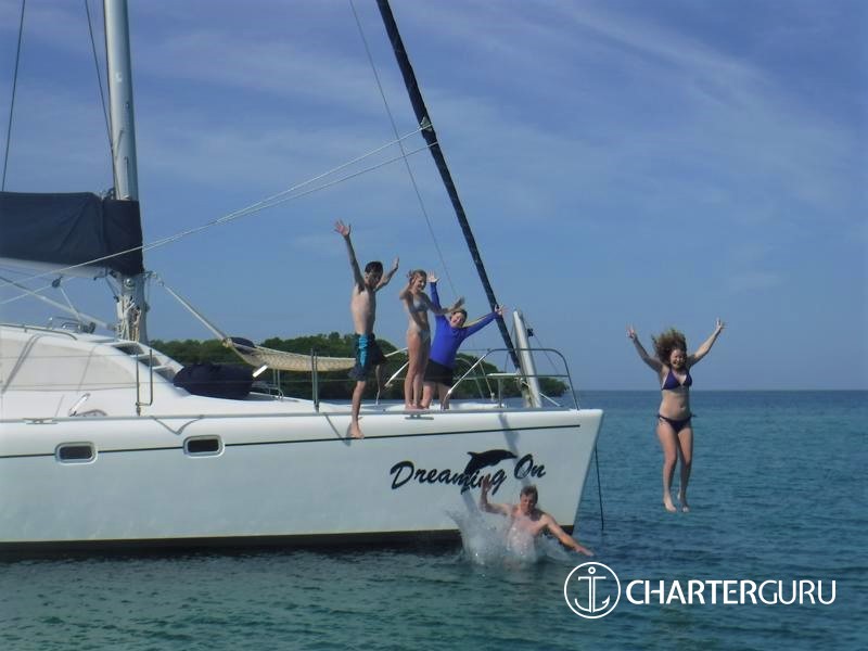 Dreaming On is a luxurious Leopard 47 catamaran offering a very spacious interior with 3 queen size guest cabins, all with en suite facilities. And outside, a large cockpit for socialising, relaxing and dining in comfort, plus loads of deck and trampoline space for sunning and relaxing in our double hammock.