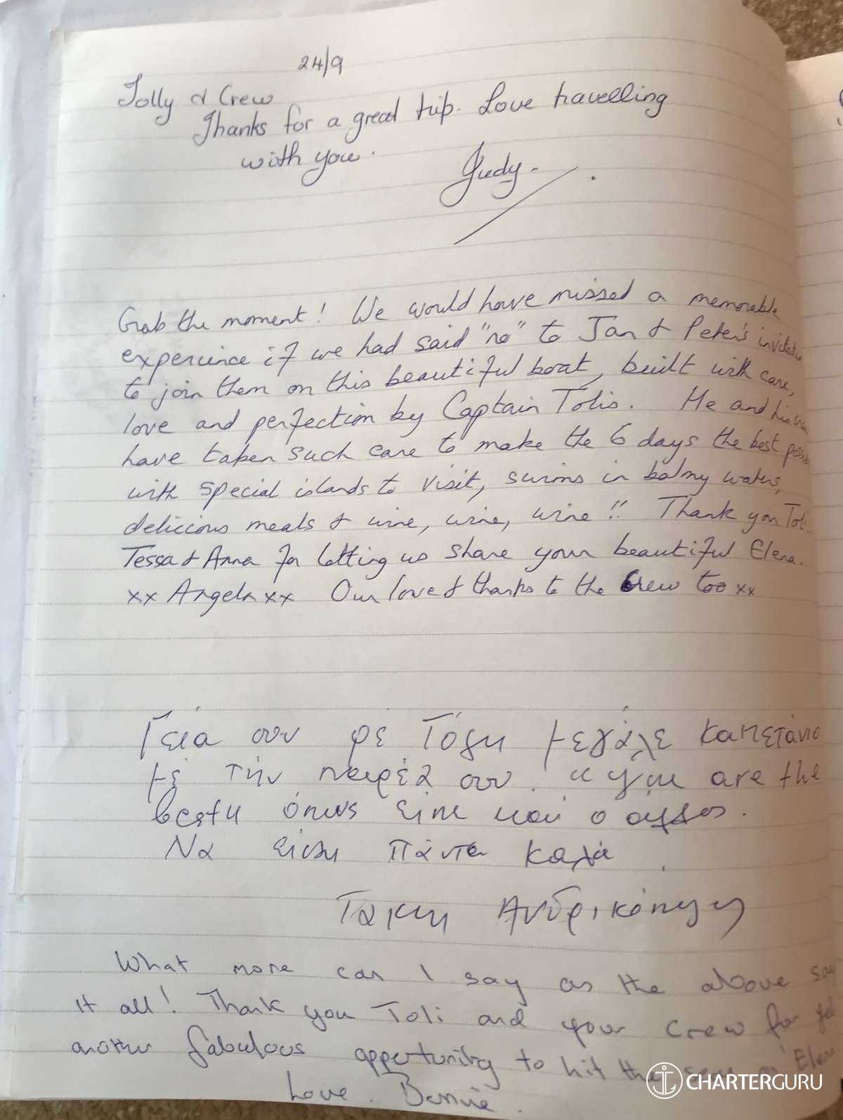 What more can I say on the above that says it all! Thank you Toli and your crew for another fabulous opportunity to hit the seas on Elena ! love Bernie