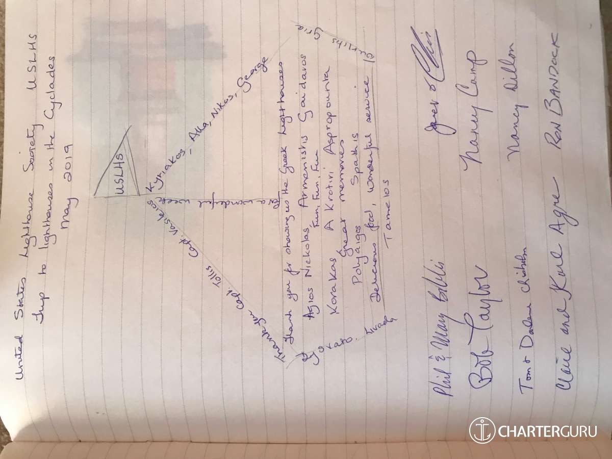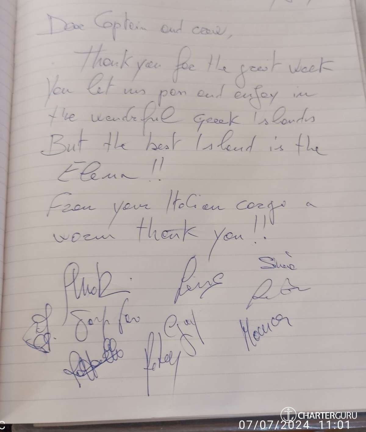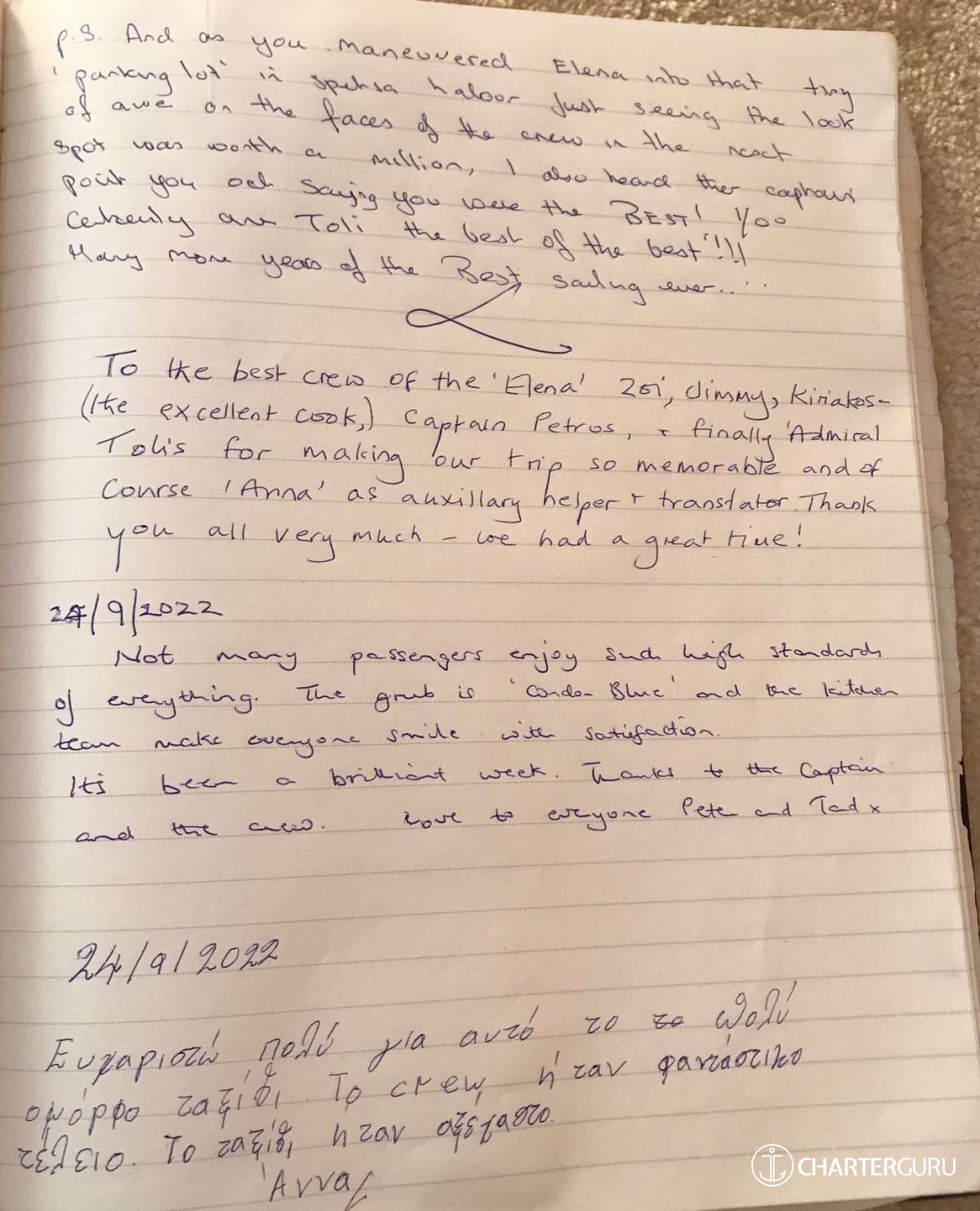 To the best crew of the Elena - Zoi, Jimmy, Kiriakos(the excellent cook), Captain Petros & finally Admiral Tolis for making our trip so memorable and of course Anna as auxiliary helper & translator. Thank you all very much - we had a great time!