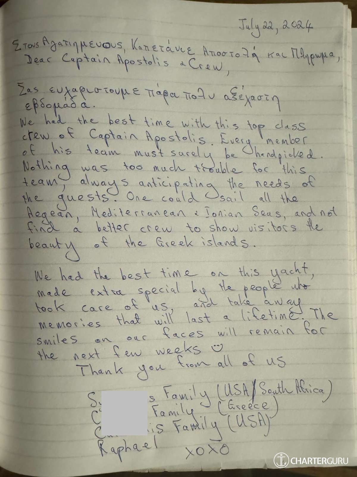 We had the best time with this top class crew of Captain Apostolis. Every member of his team must surely be handpicked. Nothing was too much trouble for this team, always anticipating the needs of the guests. One could sail all the Aegean, Mediterranean & Ionian seas and not find a better crew to show visitors the beauty of the Greek islands .