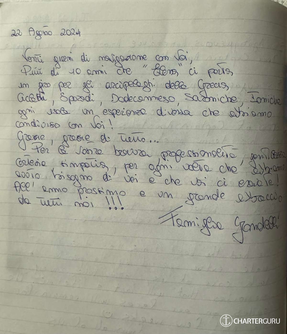 Grab the moment! We would have missed a memorable experience if we had said "no" to Jan & Peter's invitation to join them on this beautiful boat ,built with care love and perfection by Captain Tolis. He and his crew have taken such care to make the 6 days the best possible with special islands to visit, swims in balmy waters, delicious meals and wine, wine wine! Angela our love and thanks to the cew too!
