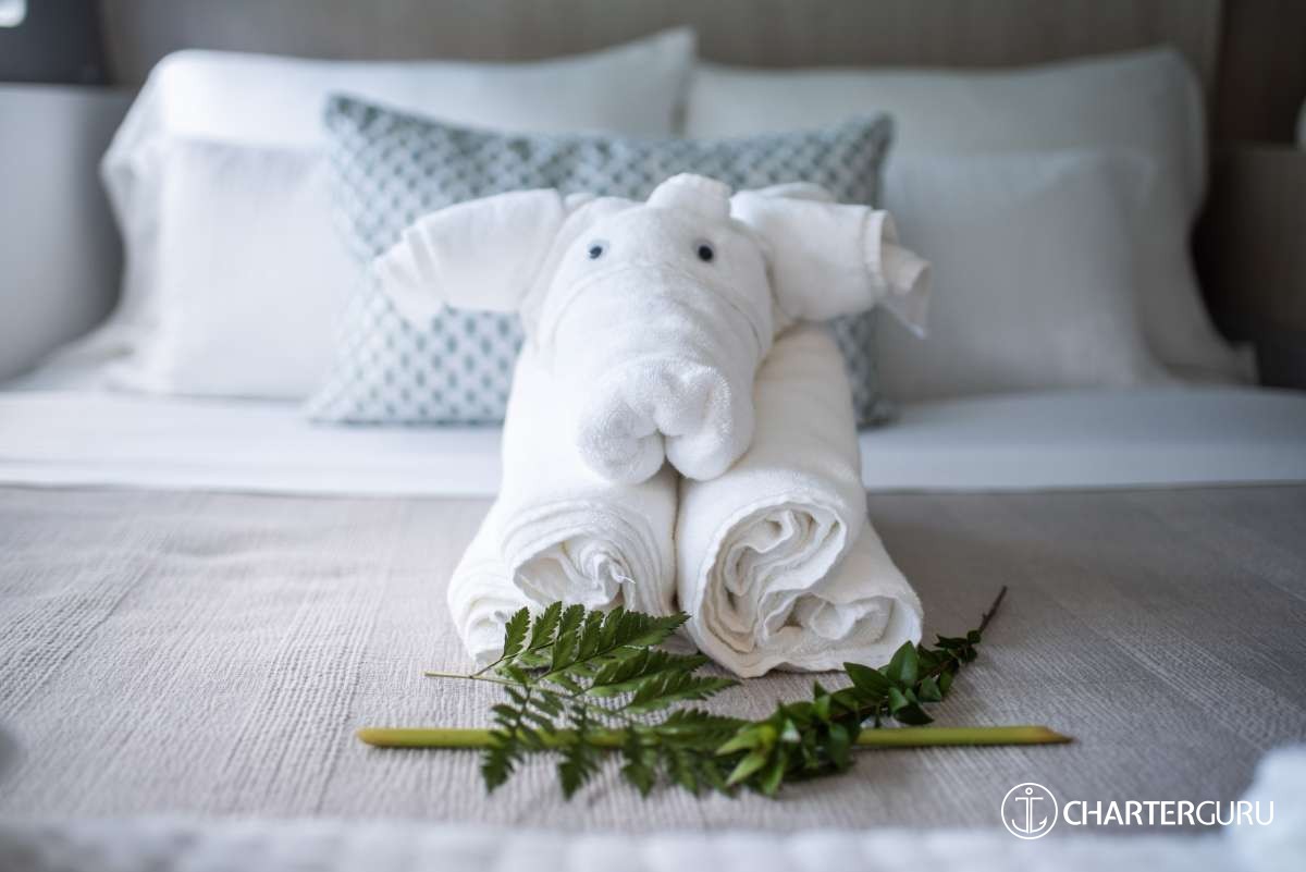 EMYSA is classified primarily as a sailing catamaran. The central space of the yacht is the main saloon, which connects to the aft deck. The aft deck is where heart of the yacht is and usually it is where you, as a charter guest, spend most of your time. The tasteful cabins are located in the 2 massive hulls. The cabins are located in the 2 massive hulls. Multiple portholes connect you with the outside world.