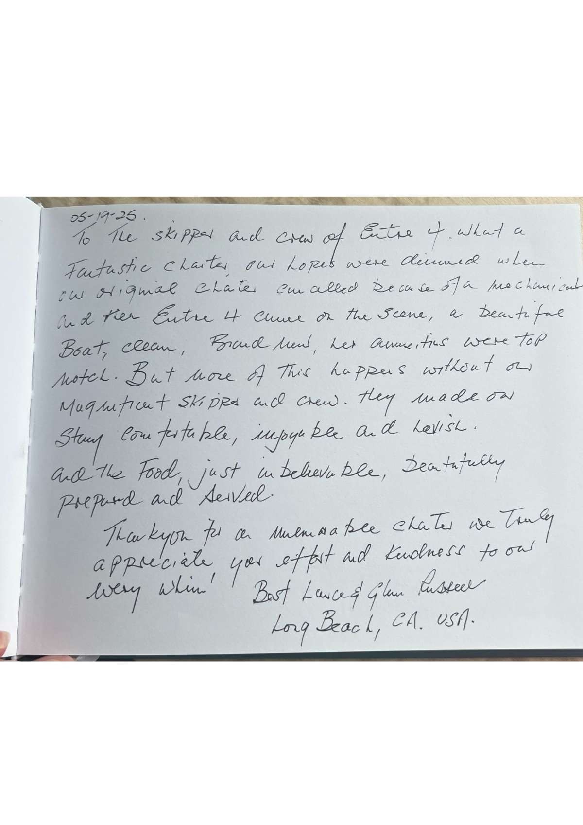 You are all a joy to be with—you are professional but also share so much of yourselves and your personalities are absolutely contagious. We look forward to watching your adventures on the Thrive and beyond and hope we will sail with you again.