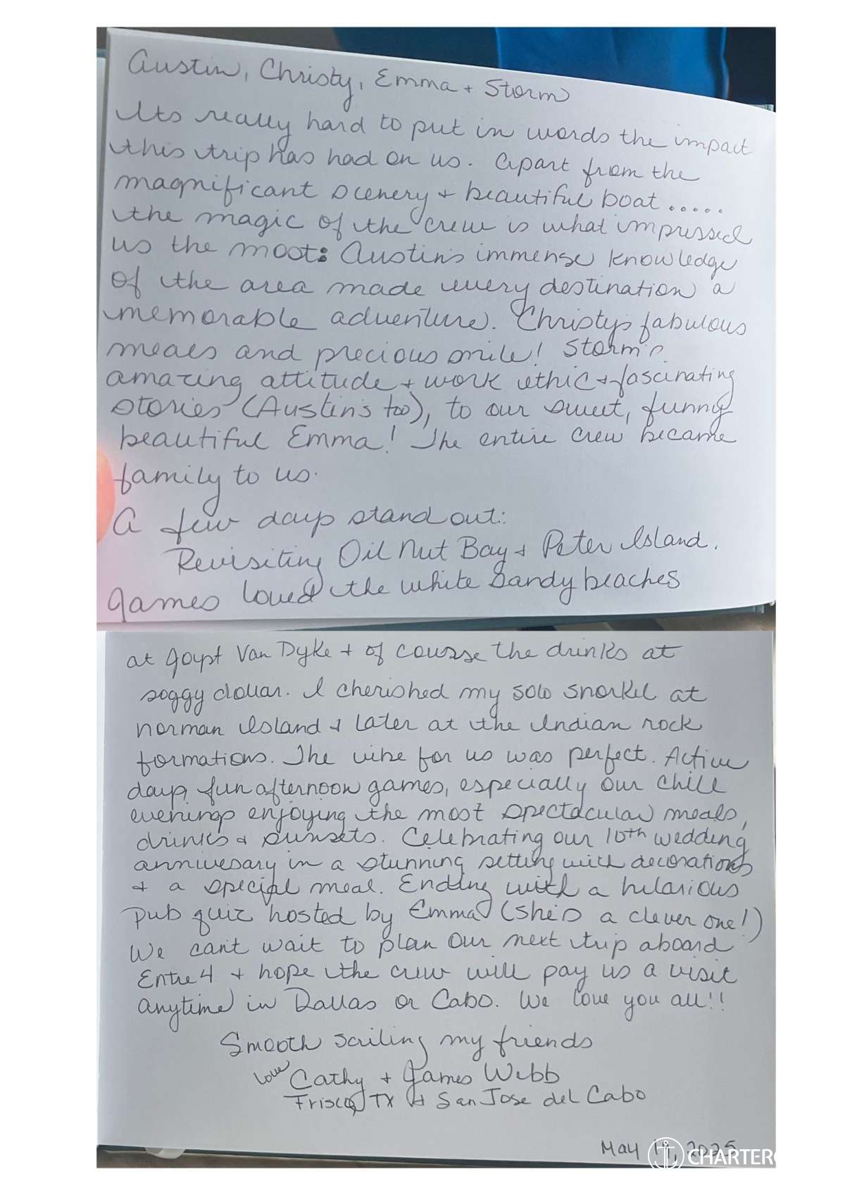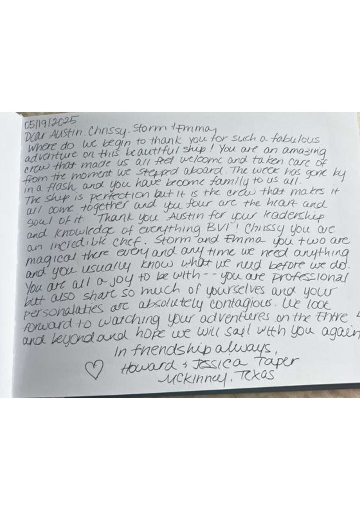 The ship is perfection but it is the crew that makes it all come together and you four are the heart and soul of it. Thank you Austin for your leadership and knowledge of everything BVI! Chrissy you are an incredible chef. Storm and Emma you two are magical—there every and any time we need anything and you usually know what we need before we do!