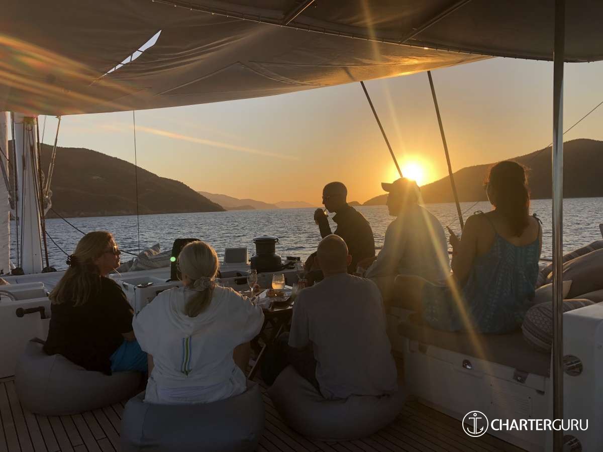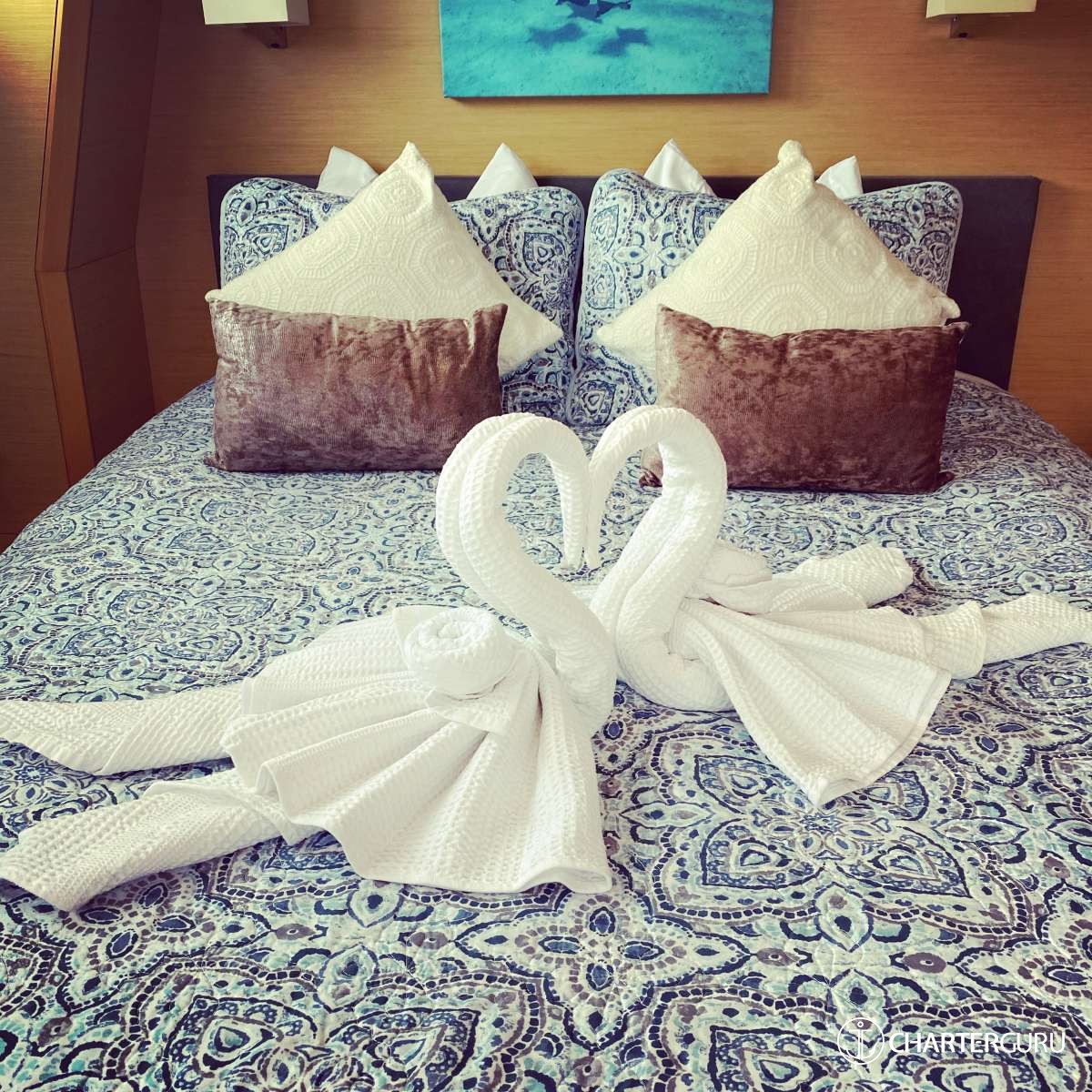 FOXY LADY is presented primarily as a sailing catamaran. The the core layout is spread out from the main saloon, which connects to the aft deck. The aft deck is generous, with a prominent dining and seating area and that's where most of the delicious meals are served. The immersive cabins are located in the 2 massive hulls. The cabins are connected by stairs to the main saloon - roomy, comfortable and pleasant. Multiple portholes supply a sunny feeling, with the option for darkness and privacy.