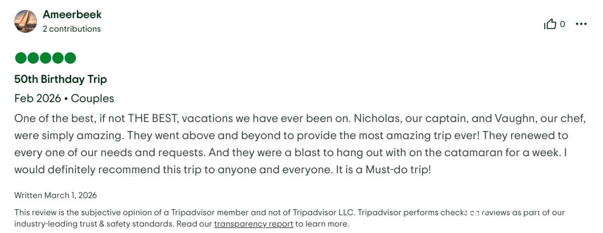 We were enamored by the attention to detail, the kindness, the service of the crew towards their guests. They were always there to serve and even teach the basics of sailing and boat life. When asked, they would share their adventures in previous roles, multiple countries, motorcycle and hiking, overlanding and camping. This previous experience, and the “heart of an adventurer” they possess seems to have prepared them for this current place in life which they excel at. They made us feel like family, and we would certainly accept them into ours!