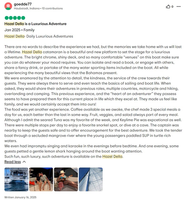 If you’re looking for the ultimate adventure in paradise, do yourself a favor and book a trip with Captain Graham and Chef Suelet on the Hazel Dela. The combination of breathtaking scenery, exhilarating activities, and mouthwatering meals guarantees that the greatest adventure is not just yet to be found; it’s right here waiting for you!