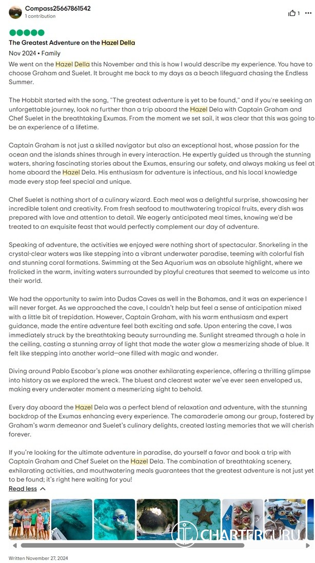 The Hobbit started with the song, "The greatest adventure is yet to be found," and if you're seeking an unforgettable journey, look no further than a trip aboard the Hazel Dela with Captain Graham and Chef Suelet in the breathtaking Exumas. From the moment we set sail, it was clear that this was going to be an experience of a lifetime.