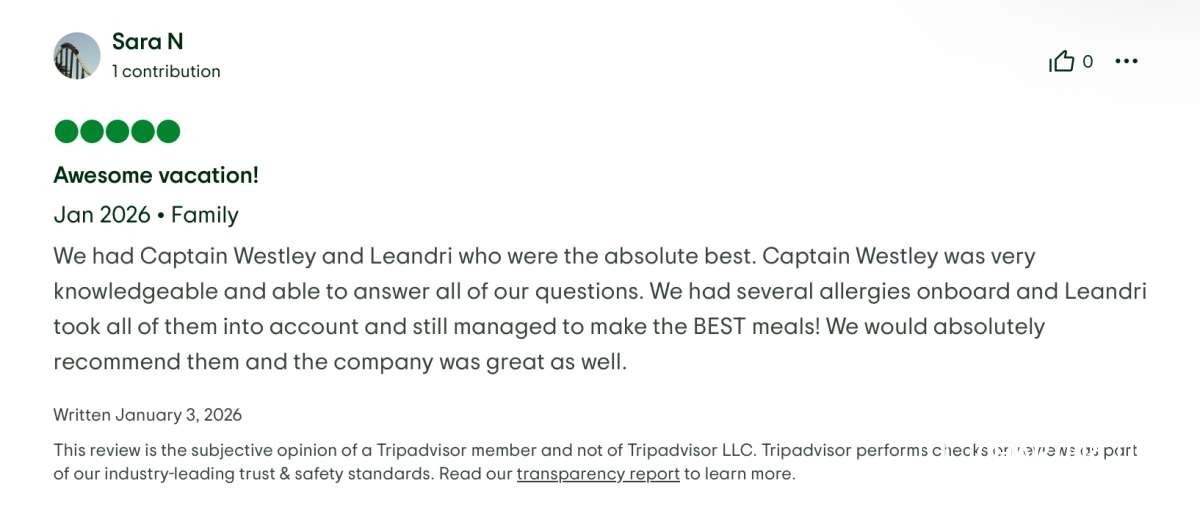 We look forward to booking another trip with the Yacht Vacation Company and without a doubt request that our new friends, Westley and Leandri, be the crew that makes another trip memorable!