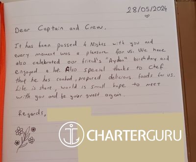 We have spent 4 nights with you and every moment has been a pleasure for us. We have also celebrated our friend Aydan’s birthday and enjoyed that a lot. Also, a special thanks to the Chef who has cooked and prepared delicious food for us. Life is short, the world is small, hope to meet you and be your guest again.