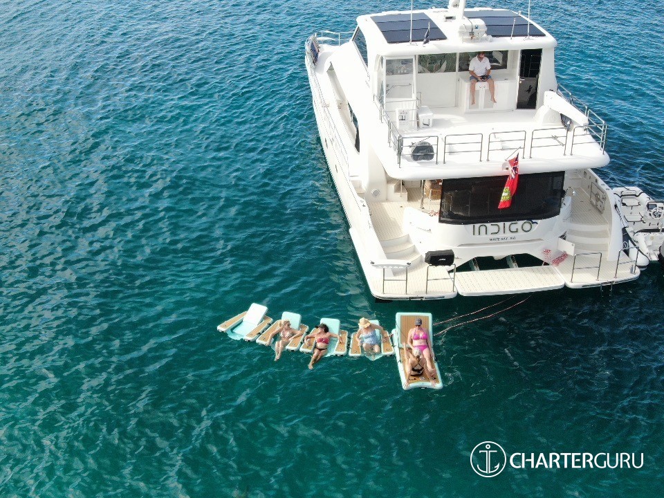 The NEW 2024 Indigo, a PC60 luxury power catamaran, impresses with its on-deck master and air-conditioned flybridge, making it a favored option among guests seeking luxury. It excels in elegance, stability, and efficiency, positioning itself as a leading choice for those desiring a lavish cruising experience.
