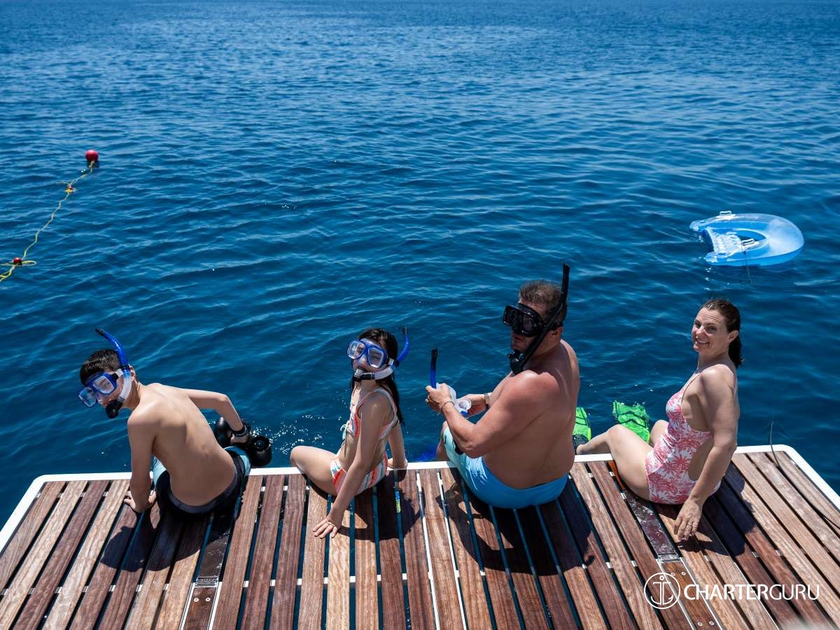 ISLAND KISSES is presented primarily as a sailing catamaran. The the heart of the yacht is the main saloon, which connects to the aft deck. The aft deck is expansive, with a comfortable dining and seating area and that's where most of the delicious meals are served. The immersive cabins are located in the 2 massive hulls. The cabins offer designer mattrace beds and feature ensuite bathrooms. Multiple portholes add to the feeling of connection with the discovered environment.