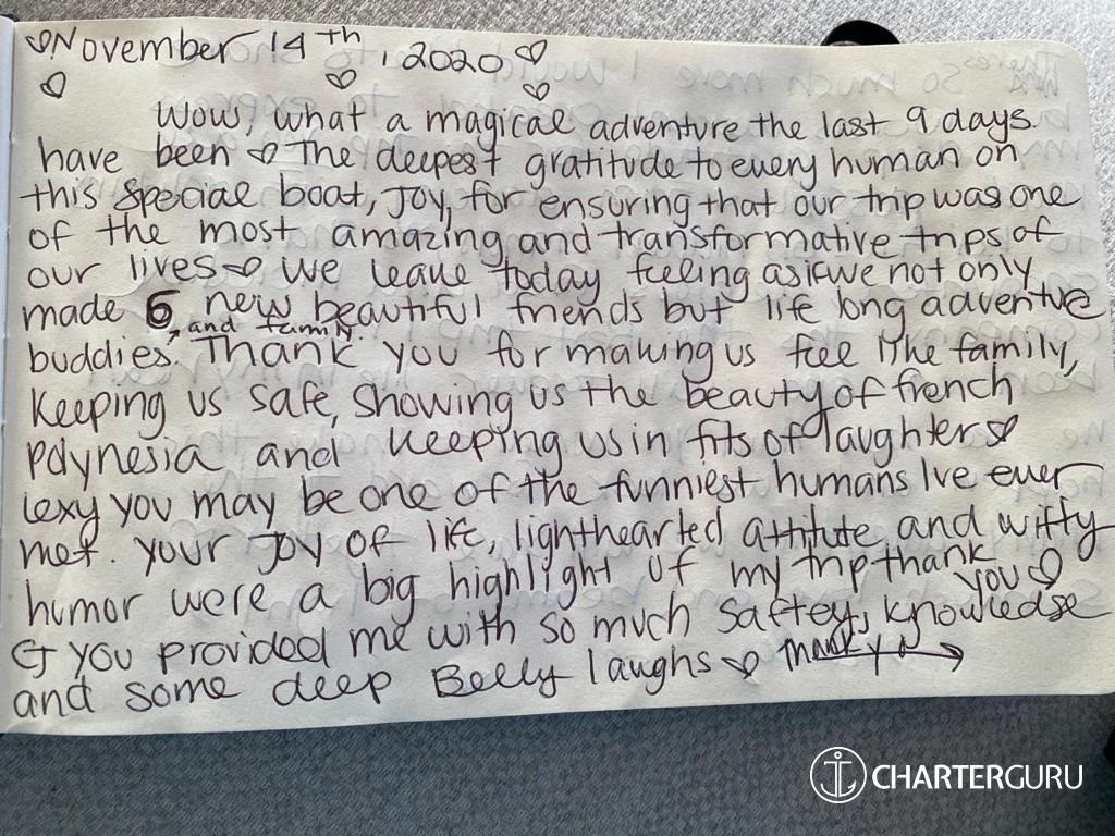 Thanks you so much for this amazing cruise on a beautiful catamaran. Joy is top of all the perfect words for an unforgettable holiday, with a perfect crew, very professional, however being very friendly, and also with amazing food, very healthy and tasty. Thanks again for everything and hope to be [back] aboard very soon.