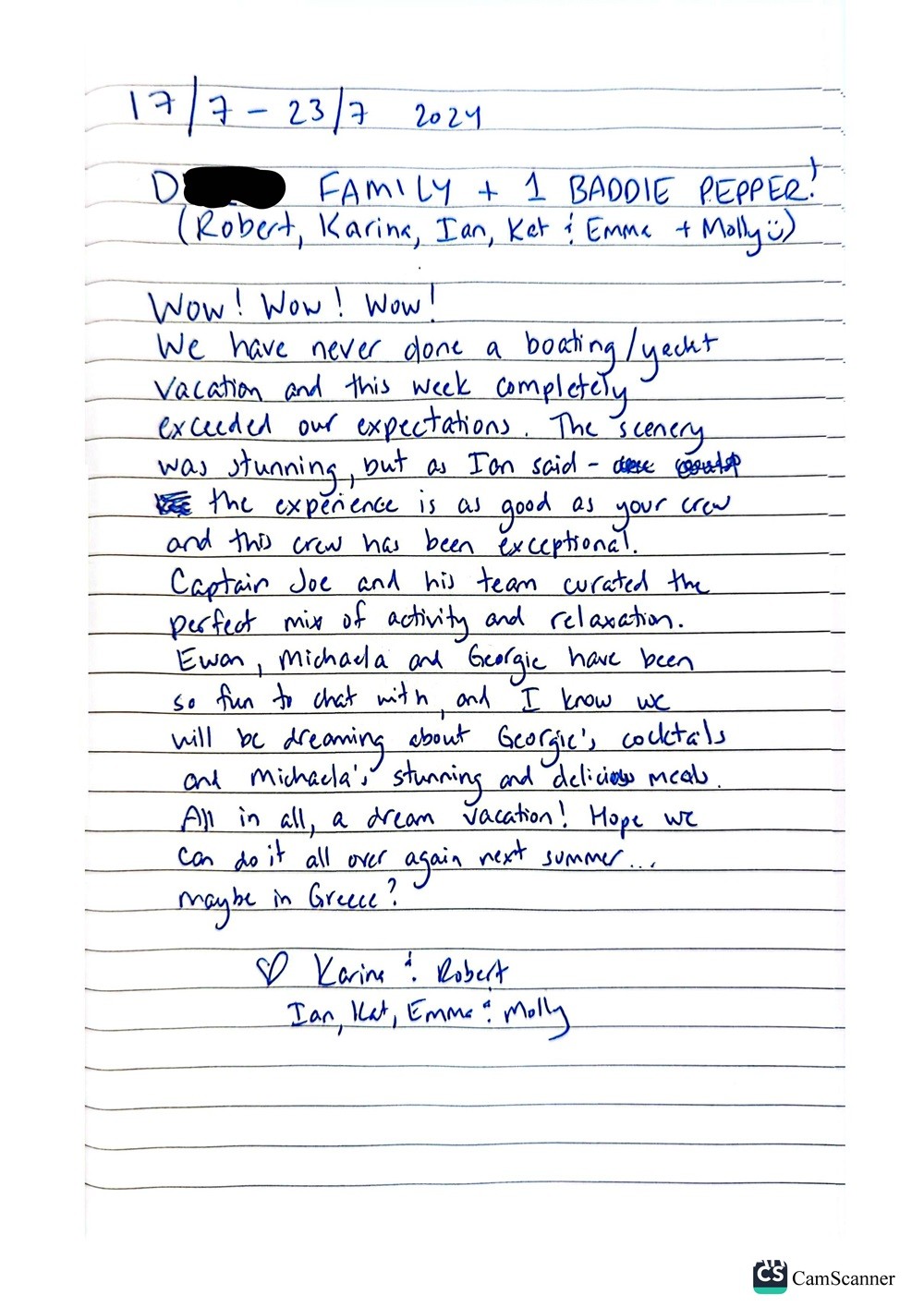 I wanted to reach out to thank you and the entire crew for a fantastic vacation.