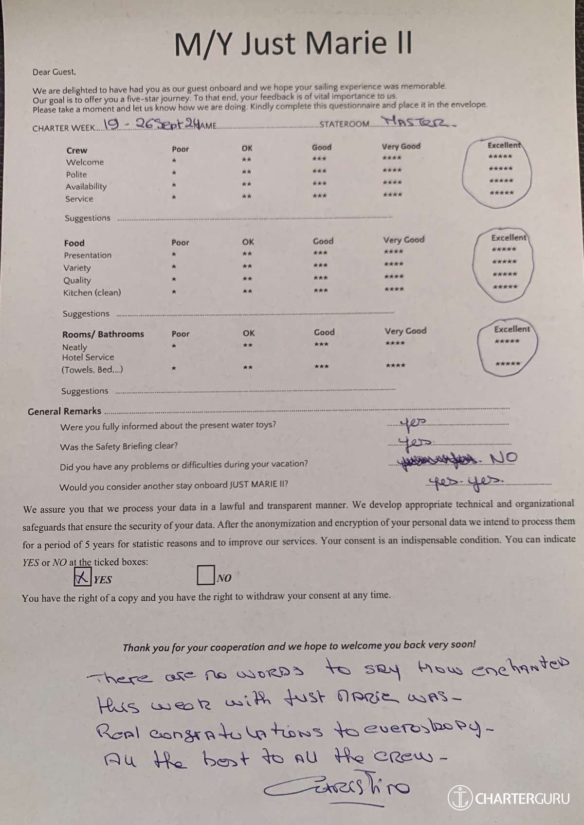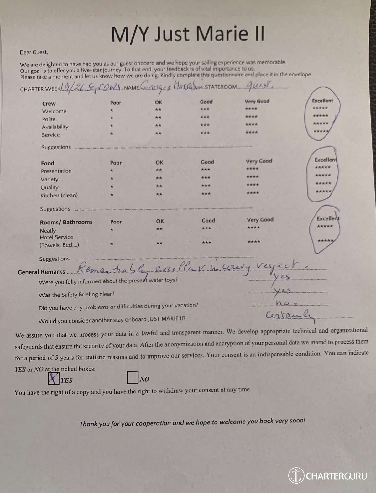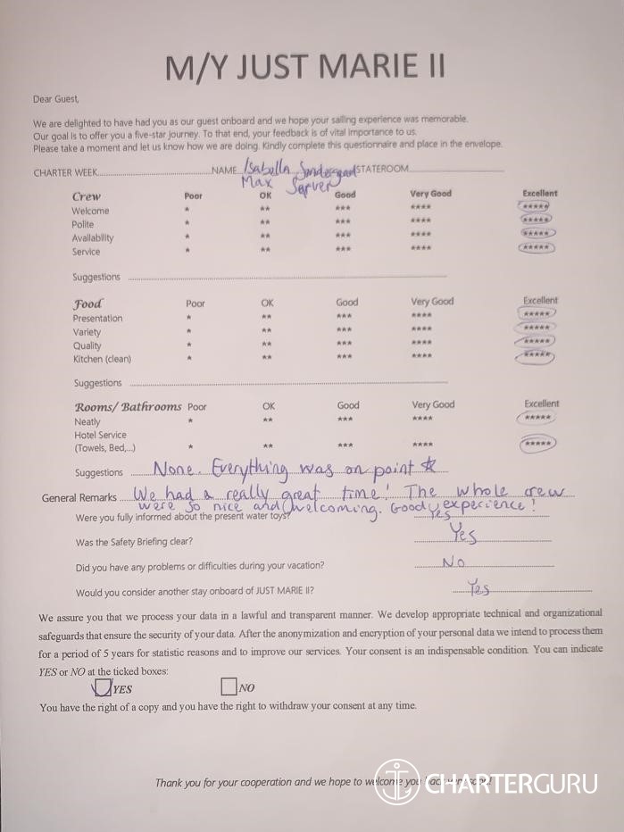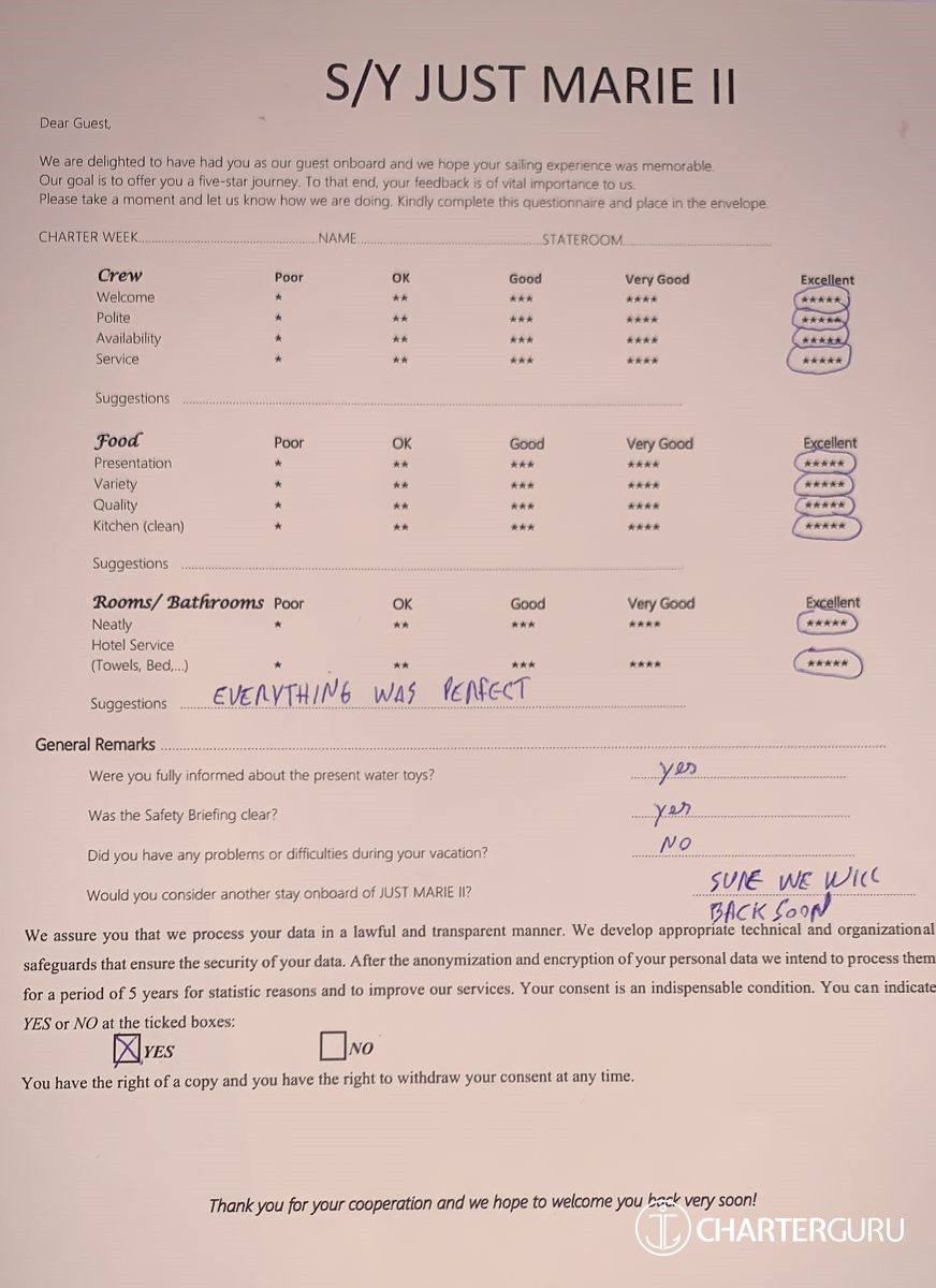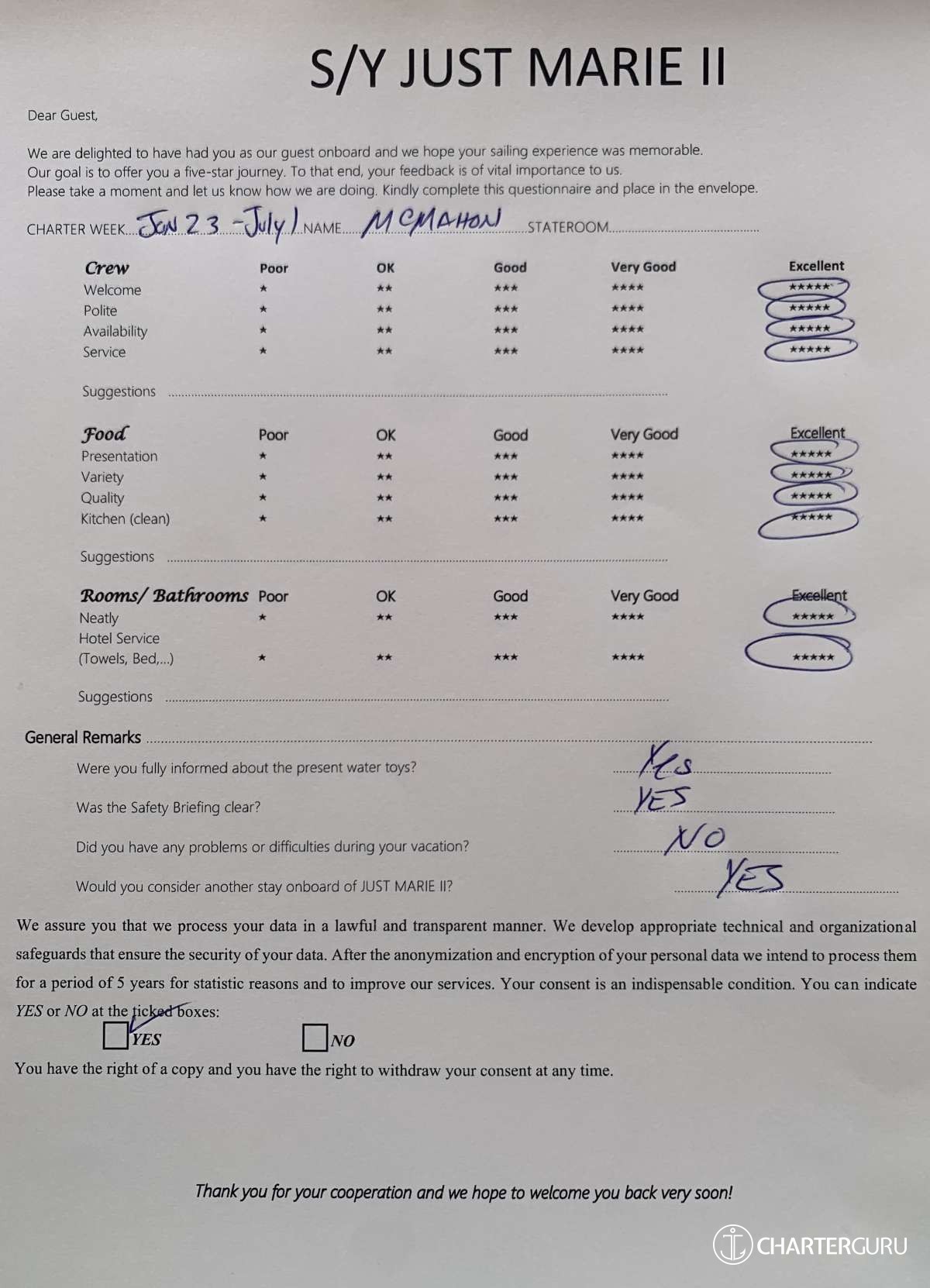 For a power catamaran like Just Marie 2, the expected APA is 20% to 35% of the charter price (€9,800 - €17,150), making the charter cost €58,800 to €66,150. Exact amount will be confirmed after inquiry.