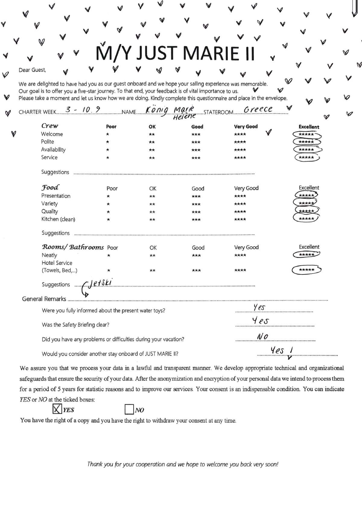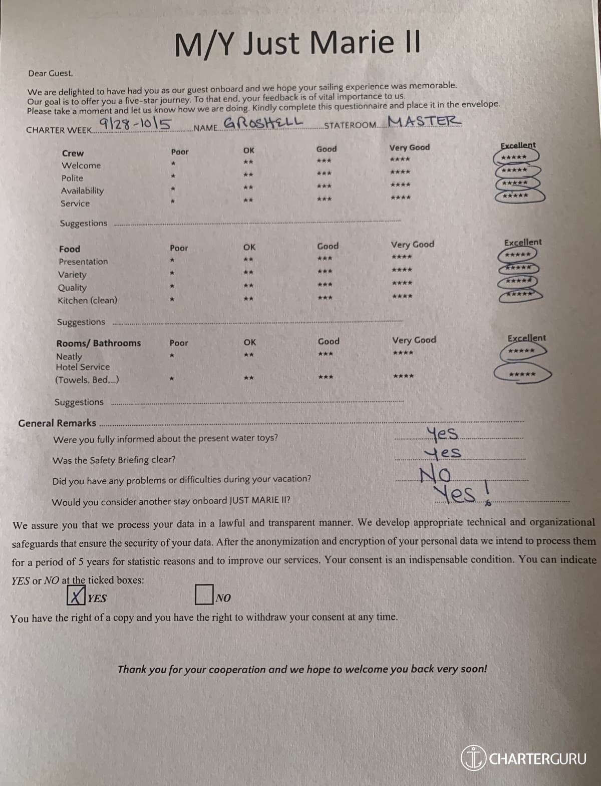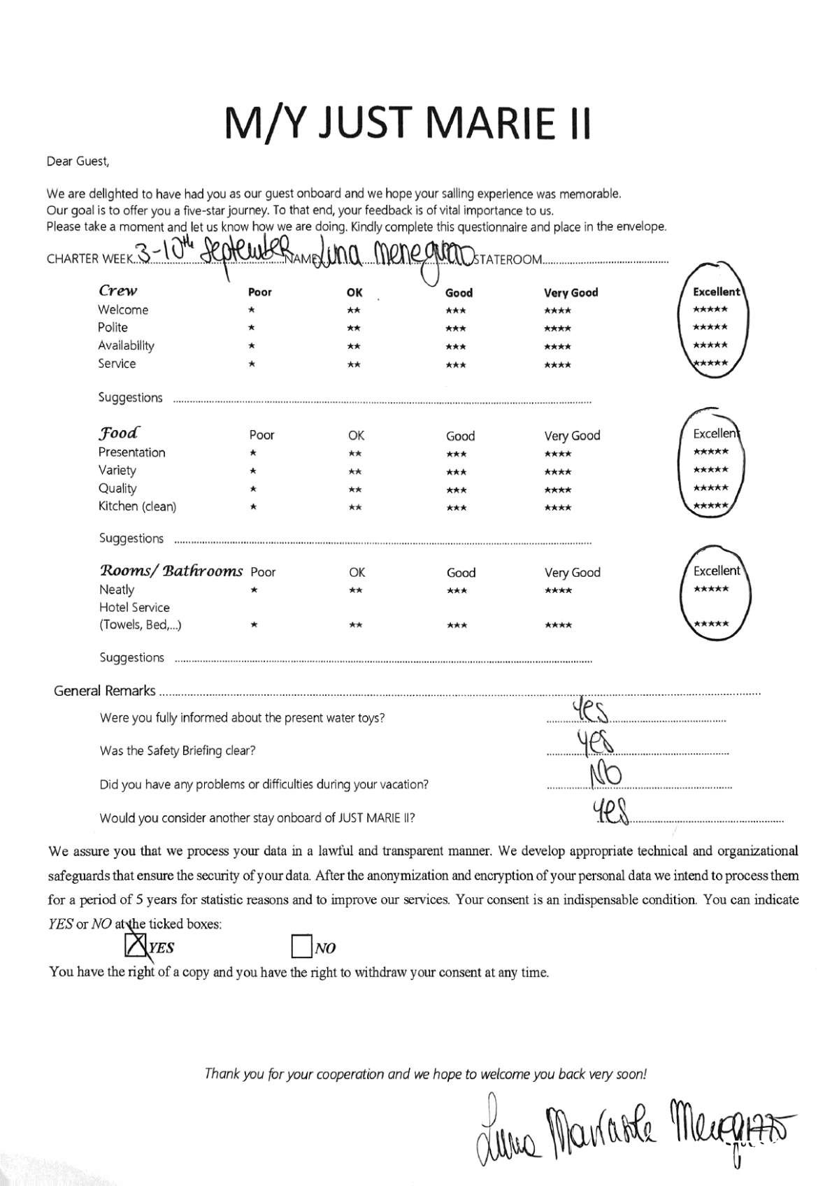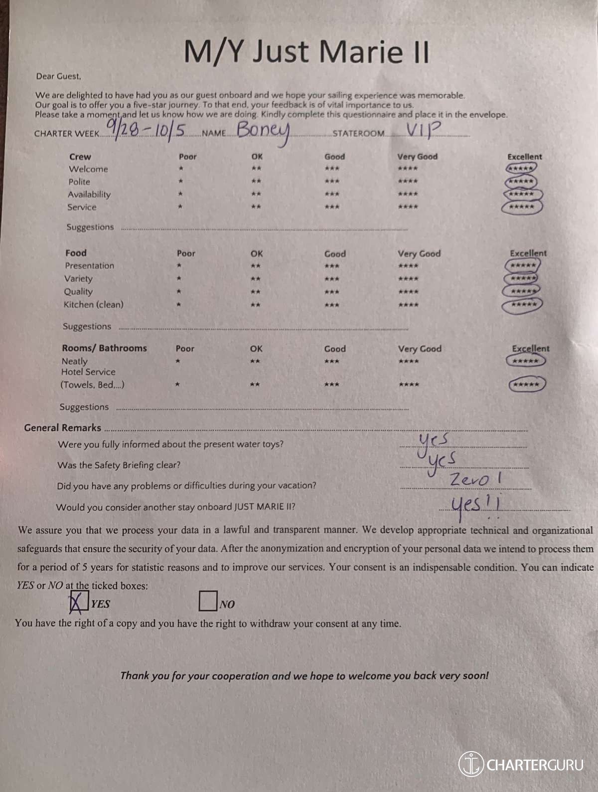 For a power catamaran like Just Marie 2, the expected APA is 20% to 35% of the charter price (€9,800 - €17,150), making the charter cost €58,800 to €66,150. Exact amount will be confirmed after inquiry.
