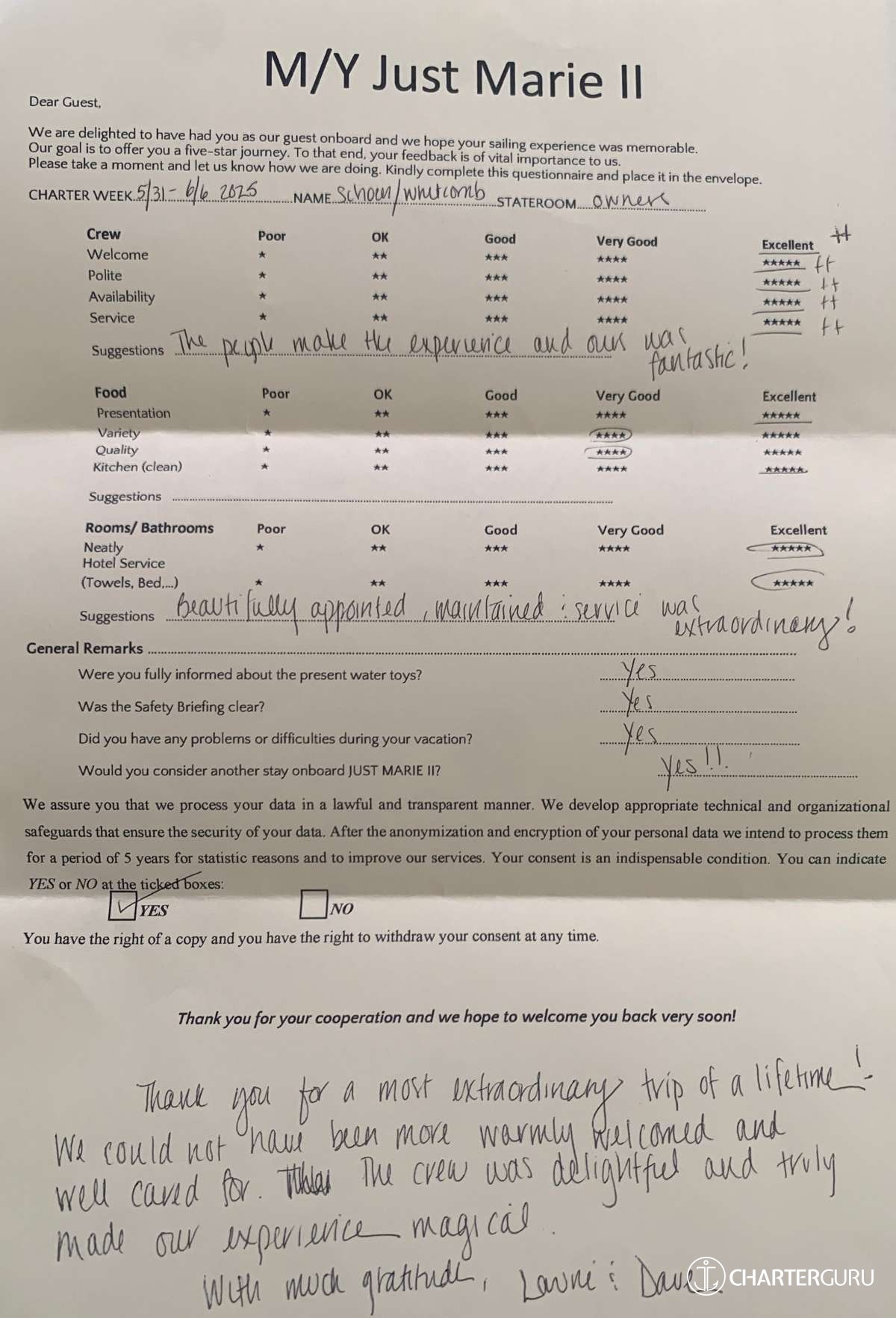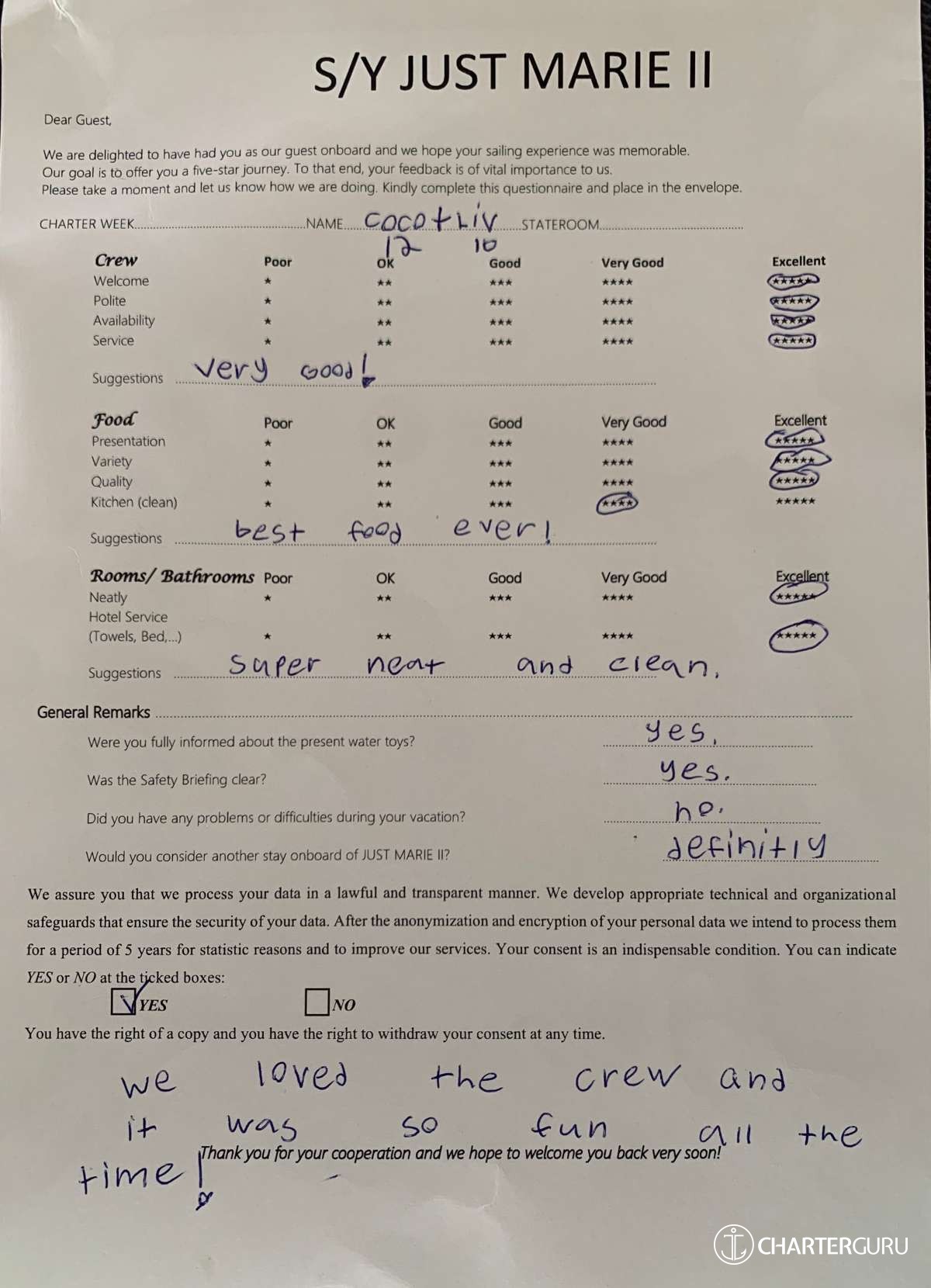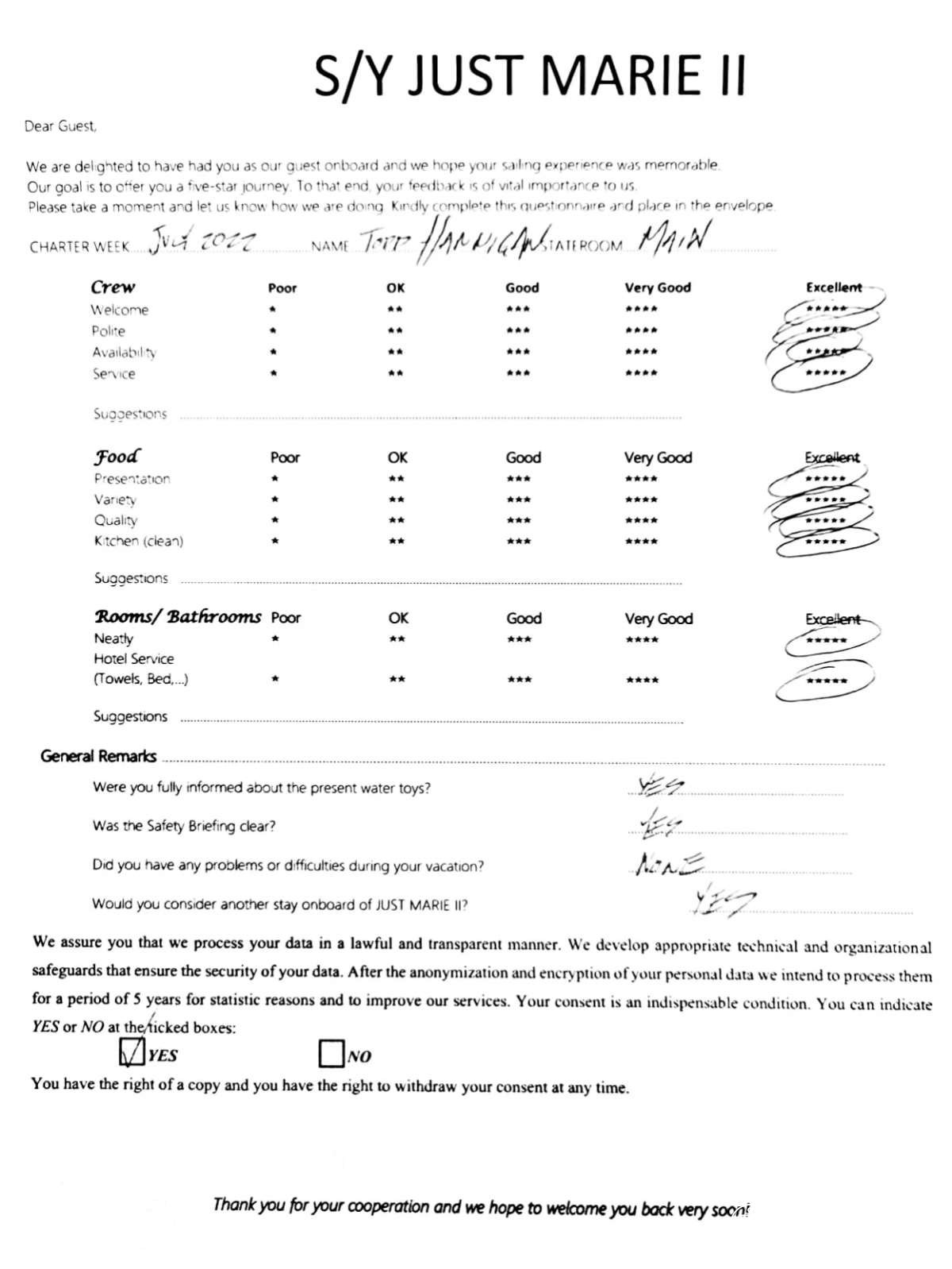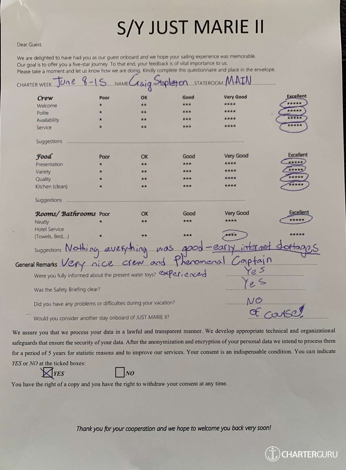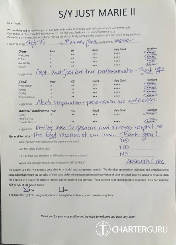 Manned by a professional crew of four, Just Marie II delivers a level of service that is personalized, discreet, and exceptional. The crew has been together for over 5 years, forming a seamless team affectionately known by guests as “the cream team.” Their dedication and hospitality have earned many repeat clients who return year after year for the warm atmosphere and impeccable service that define the Just Marie II experience.