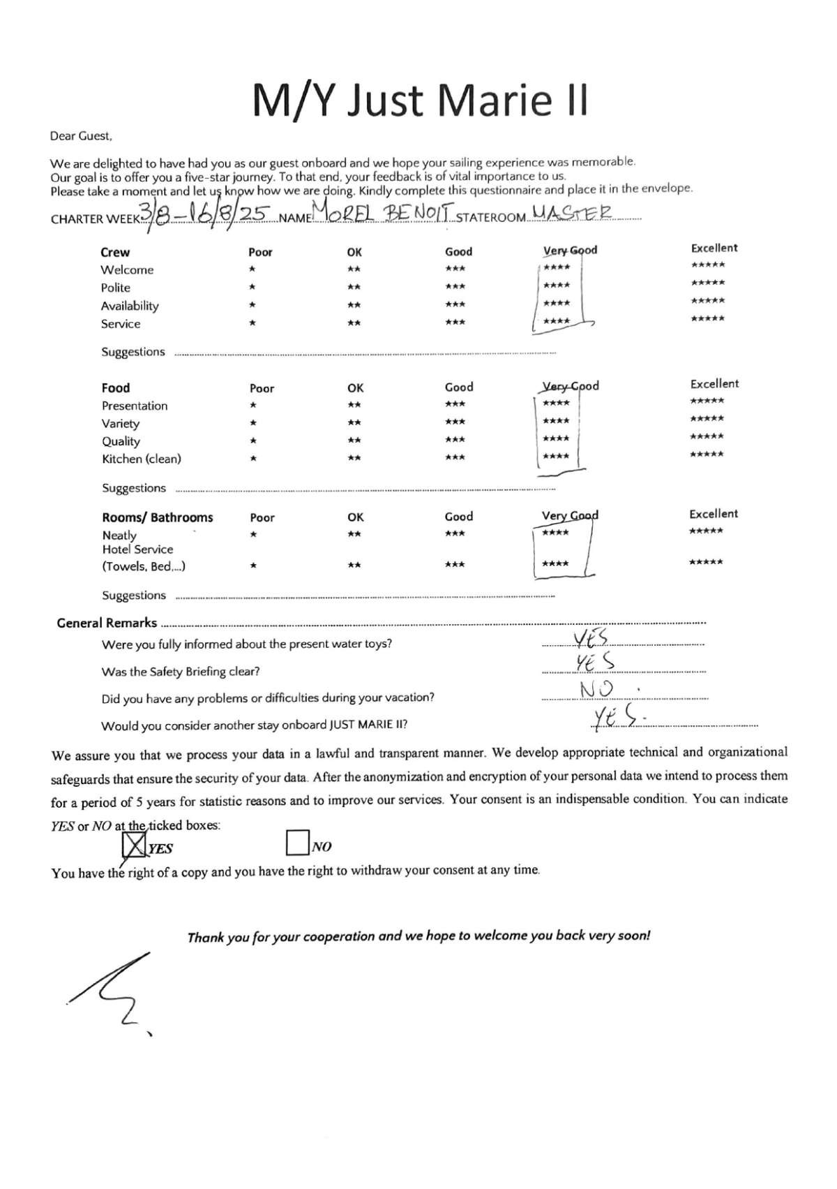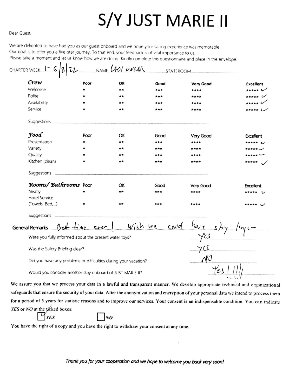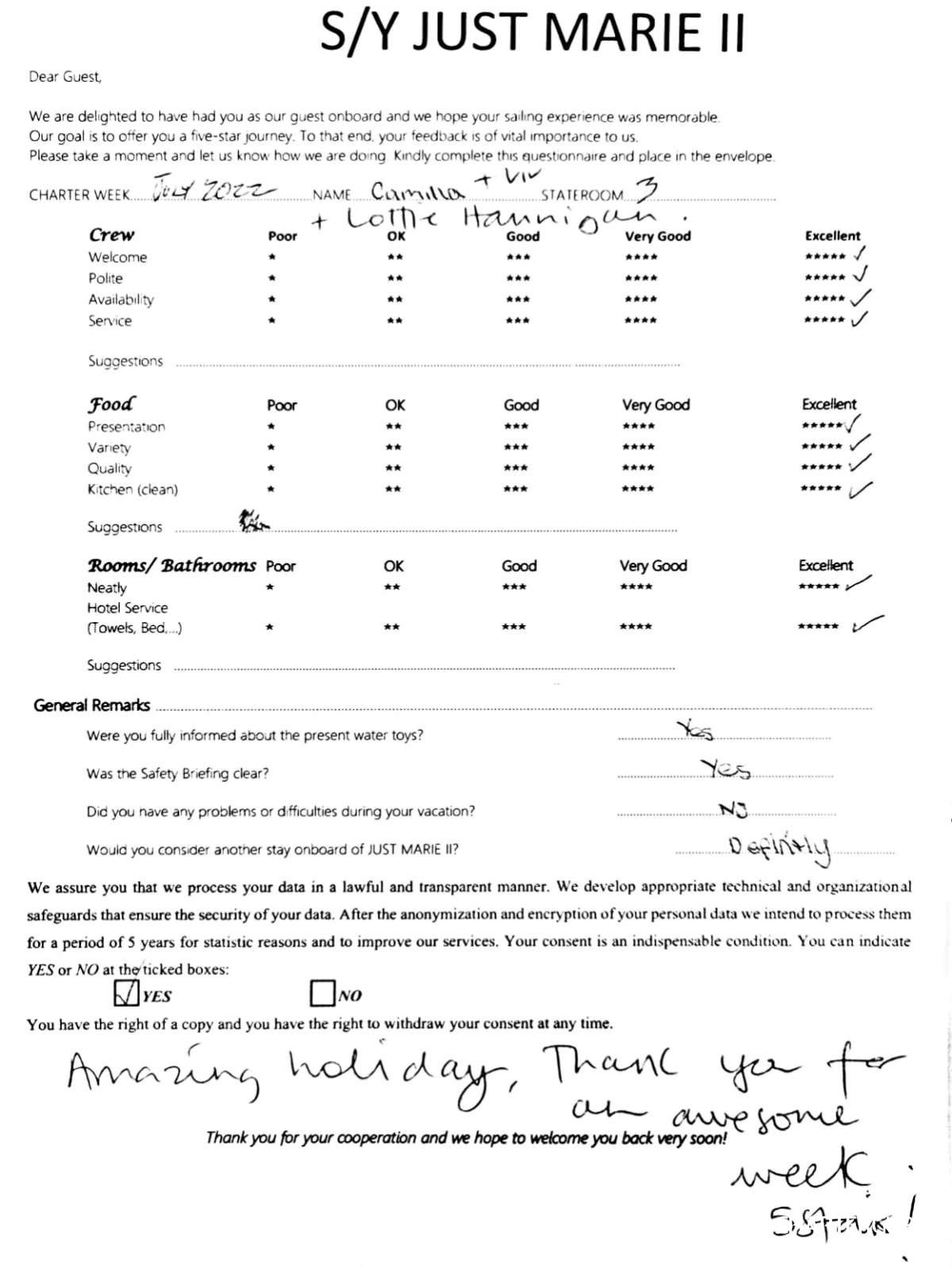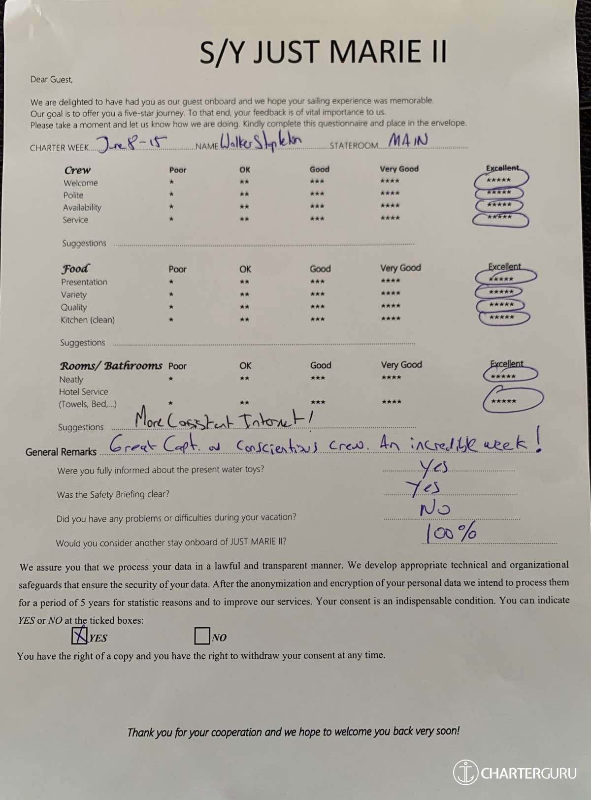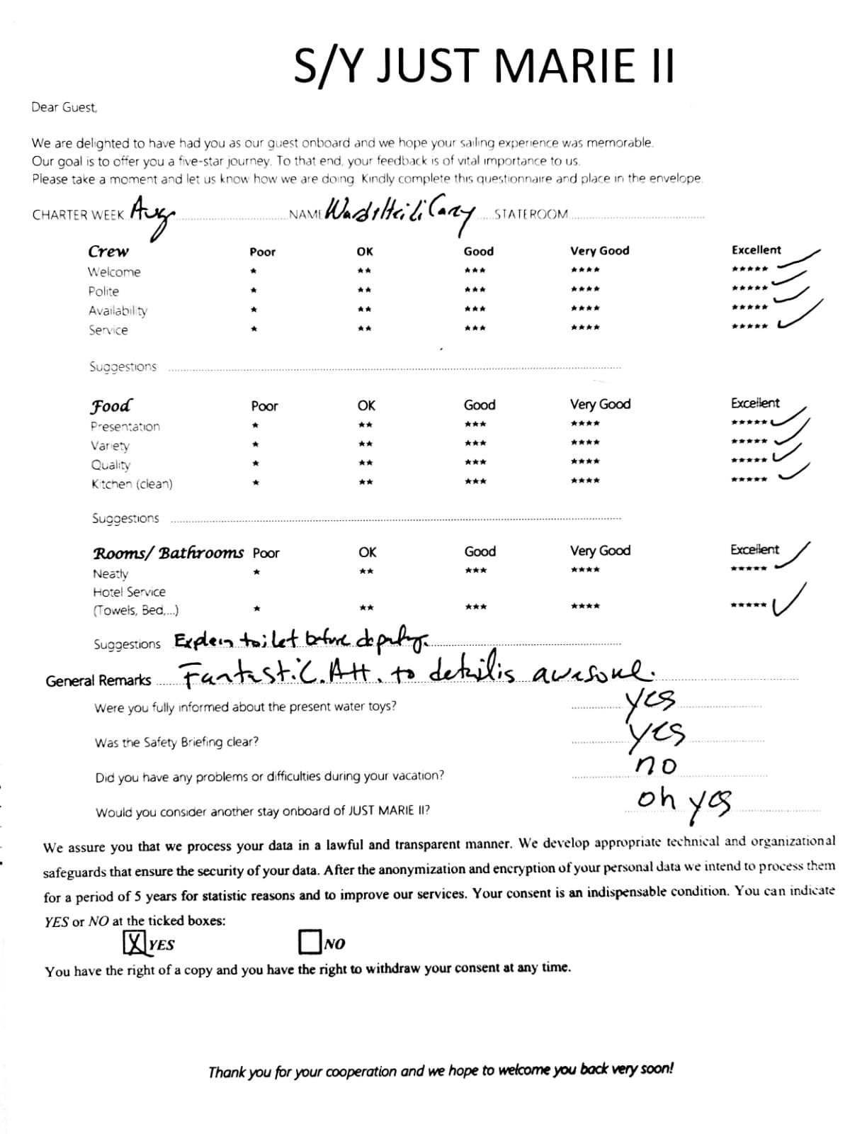 Manned by a professional crew of four, Just Marie II delivers a level of service that is personalized, discreet, and exceptional. The crew has been together for over 5 years, forming a seamless team affectionately known by guests as “the cream team.” Their dedication and hospitality have earned many repeat clients who return year after year for the warm atmosphere and impeccable service that define the Just Marie II experience.