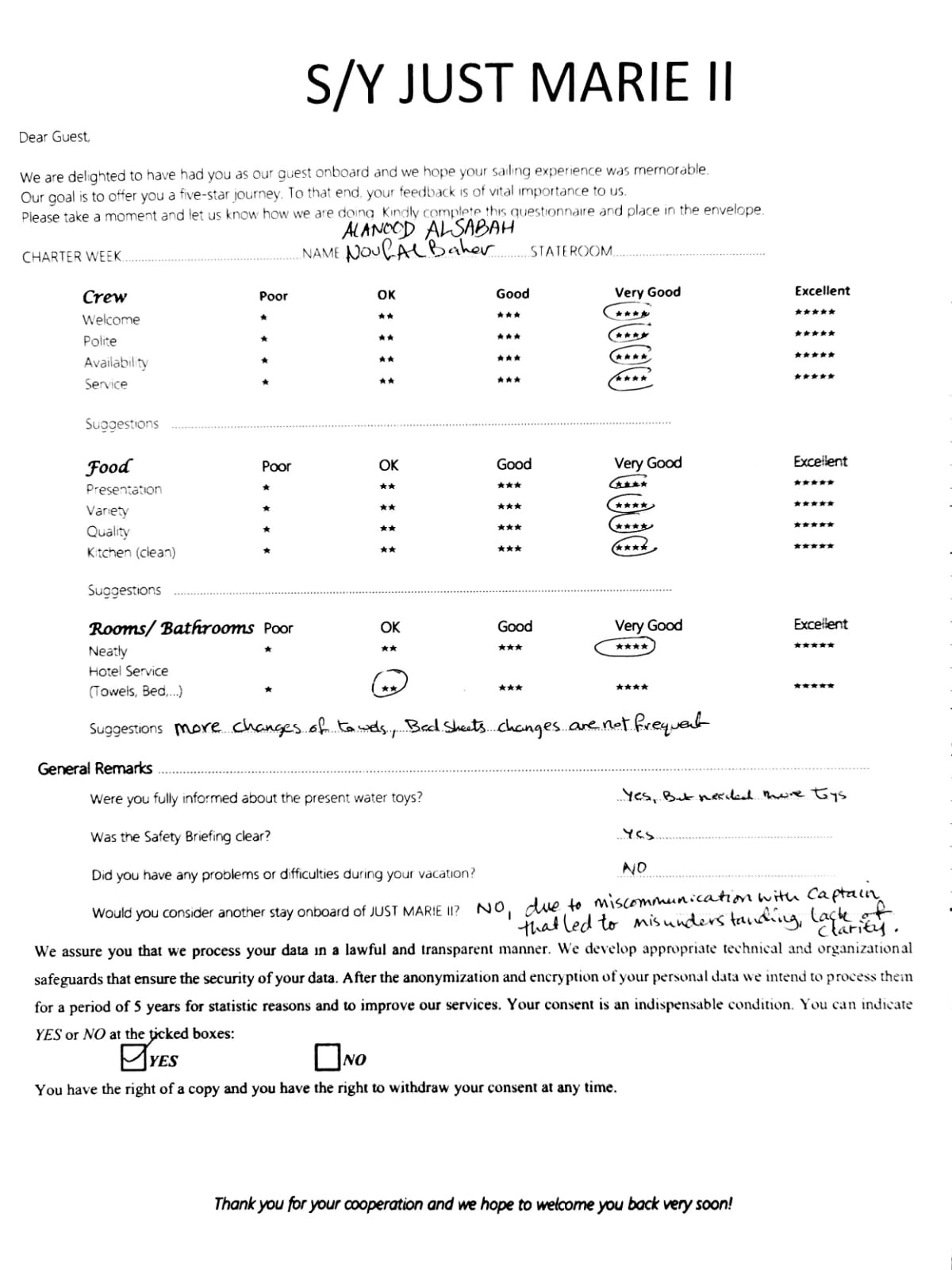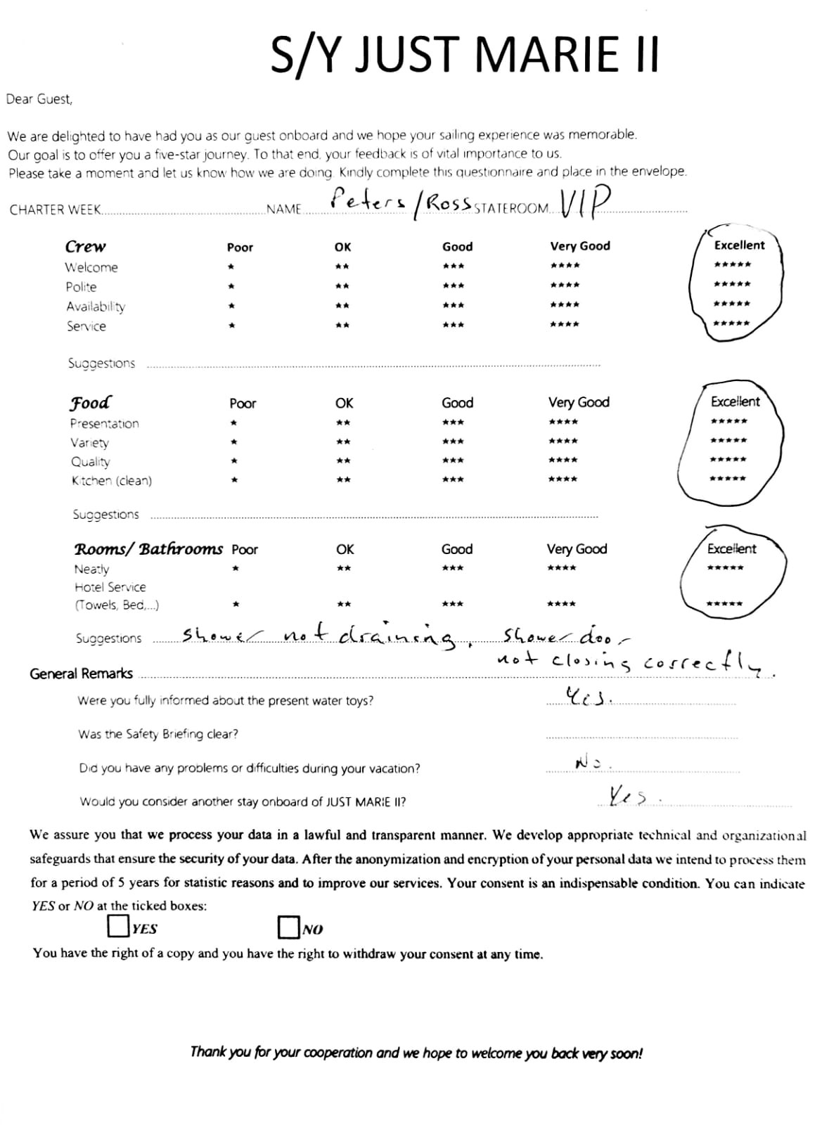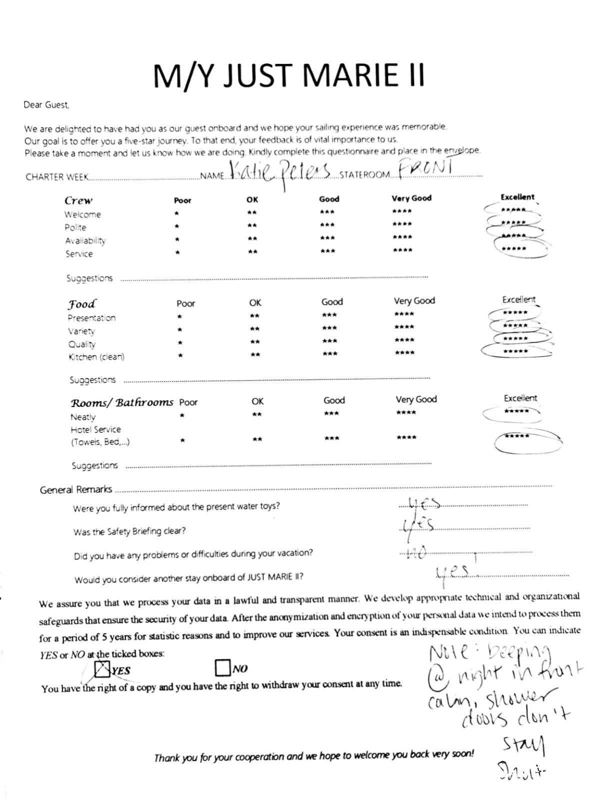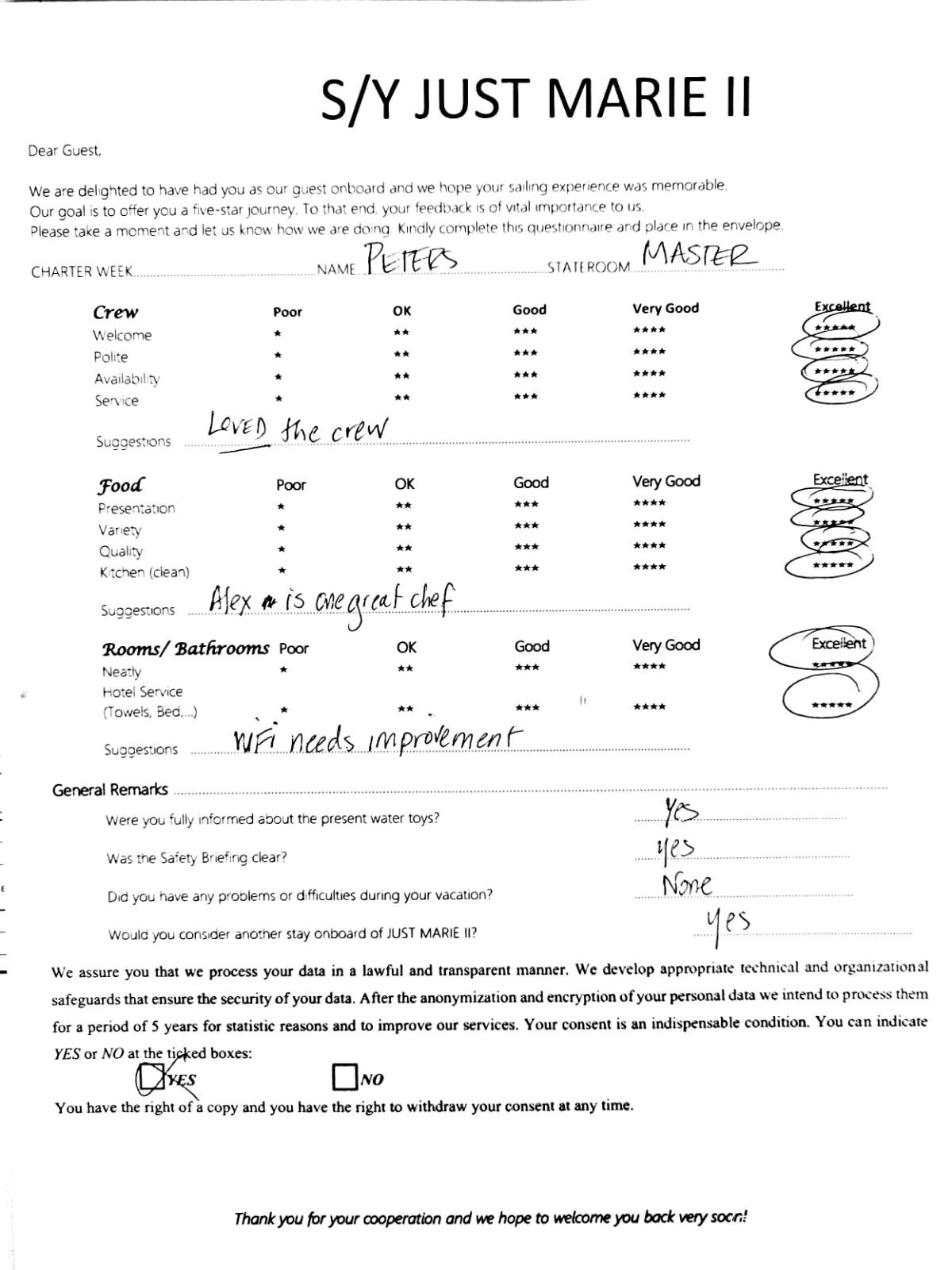Manned by a professional crew of four, Just Marie II delivers a level of service that is personalized, discreet, and exceptional. The crew has been together for over 5 years, forming a seamless team affectionately known by guests as “the cream team.” Their dedication and hospitality have earned many repeat clients who return year after year for the warm atmosphere and impeccable service that define the Just Marie II experience.