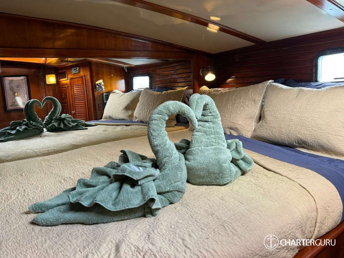 (2) Queen master cabins have a private ensuite head and stall shower. (1) Bunk Bed Room(1) Queen forward V-berth has ensuite vanity and shares head with twin bunk cabin below.