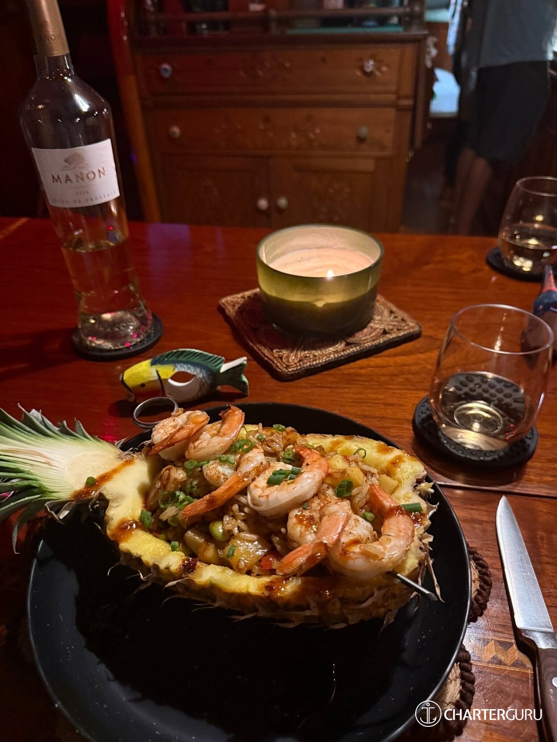 Dining is not the same on a chartered yacht either. On a cruise ship you have multi-course meals with multiple choices for each course. That, of course, is just not possible when you have one chef working in a small galley. However, Maddie did an exceptional job preparing meals. She sent us a pre-cruise survey asking our food preferences; we presented her with something of a challenge because our tastes are somewhat incompatible: my wife and daughter love seafood, but I hate it. I fully expected that there would be some meals where I ate just a salad or nothing at all, but Maddie came through excellently: even on nights when she prepared seafood for the ladies, she usually managed to make the same dish for me but with meat instead. For example, one evening she prepared a skewer of scallops, served on a pineapple half with rice; I got a skewer of steak instead. The food was also delicious: if you charter this boat, be sure to request that Maddie make her key lime pie.
