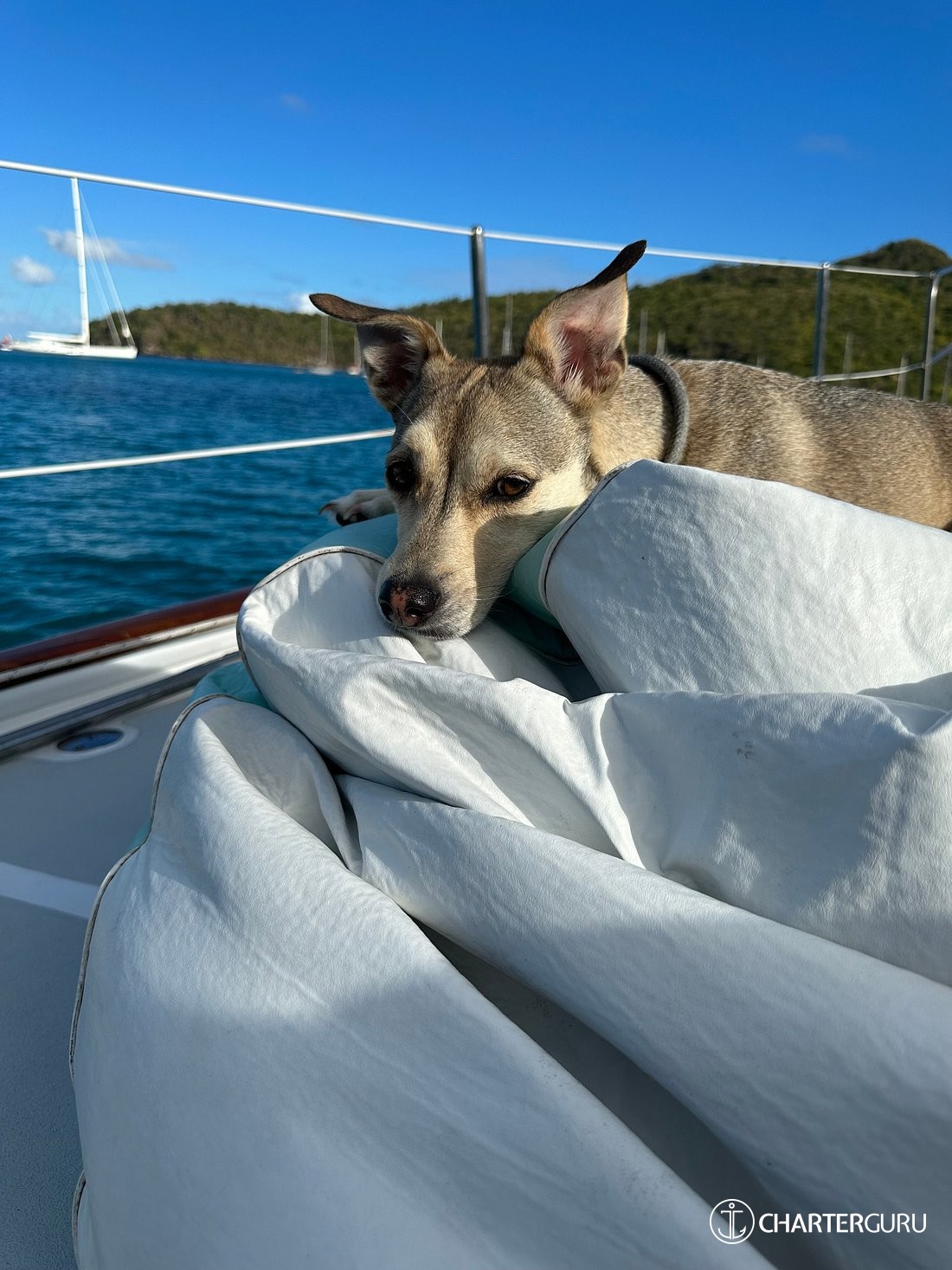 Originally a St. John COVID-19 foster pup, Sam is now a permanent and invaluable member of Kai’s crew. While running her first charter, it became clear that she knows how to win over a crowd. A few weeks later, Sam crossed the North Atlantic on a non-stop, eight-day trip from USVI to Newport, Connecticut where we spent the summer doing “dirty boatyard work and learning all the boat things.” The following fall, she proved her skills on a 14-day passage upwind back to the USVI before running a very productive 2021 charter season. She also stole the show during the filming of “Knowing You” by Kenny Chesney with her sweet, laidback nature.