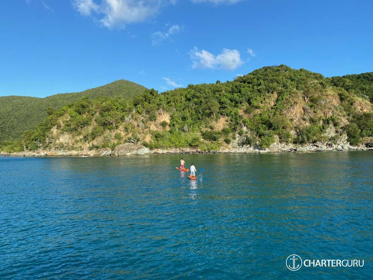 Luna Bliss was a spacious and well-equipped 47 ft catamaran with plenty of room for our group of 4 couples. There were many places to hang out, including the bow of the boat, the upper deck, the inside main cabin and outside main decks. The boat was also equipped with a tablet that comfortably fit 8 adults, as well as full snorkel gear, 2 paddleboards, and a water mat to lounge on. Beach towels were provided for everyone, and there were multiple clips to hang dry towels and any wet clothes that needed drying.
