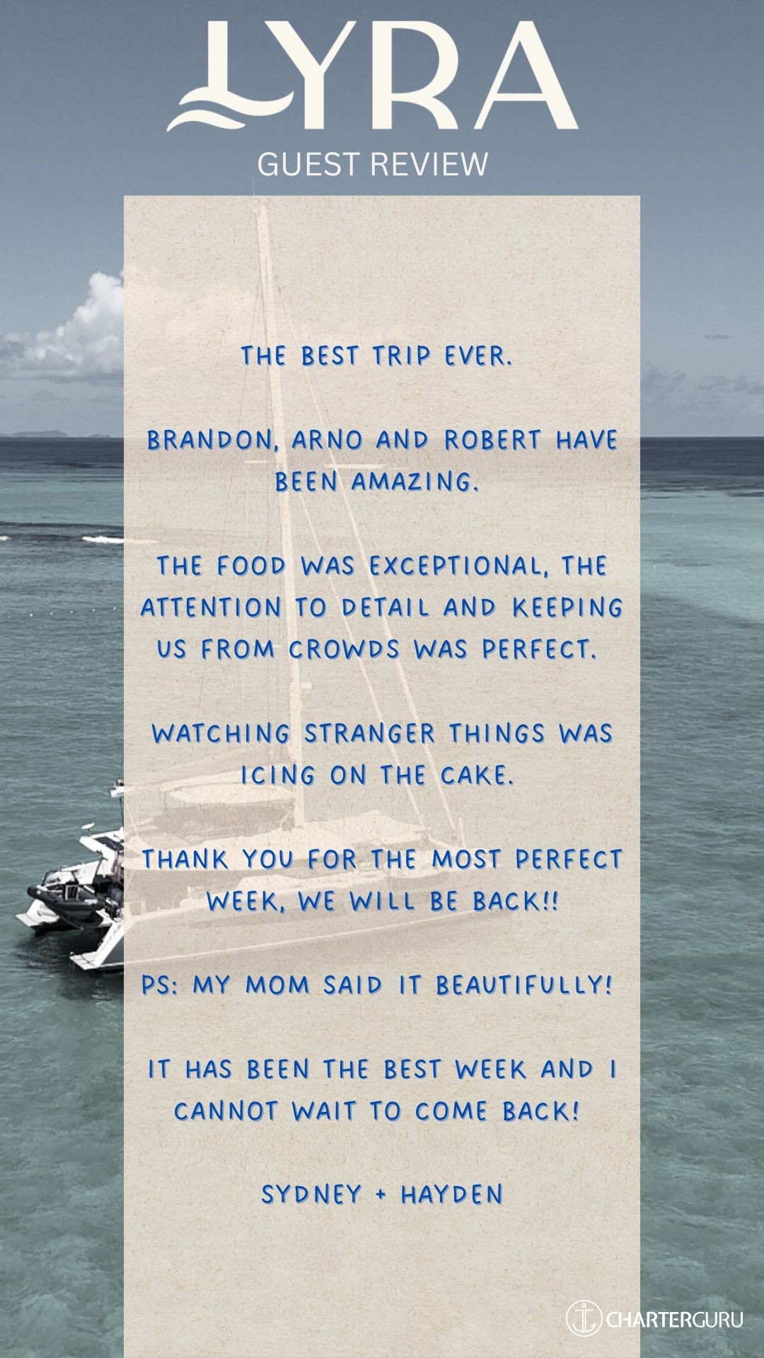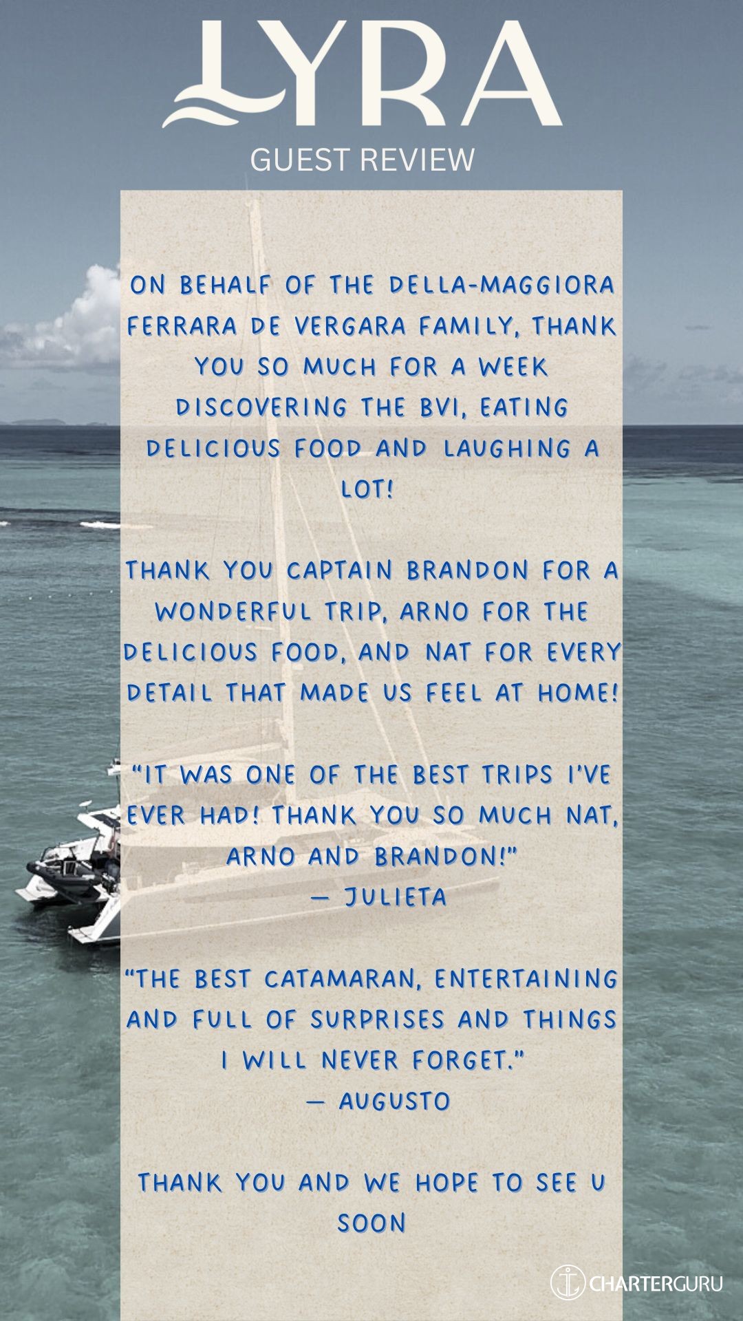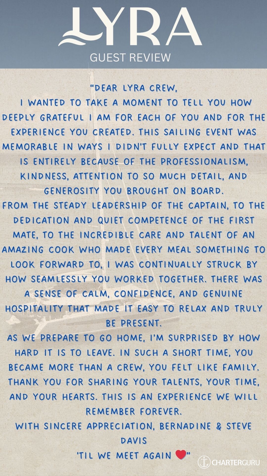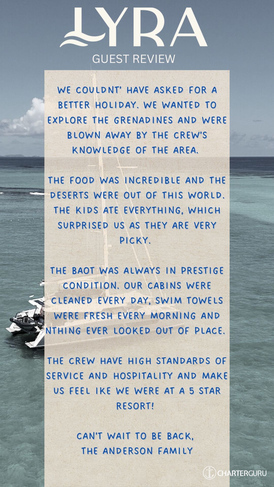 We adore the Lyra crew and we recommend her to everyone!