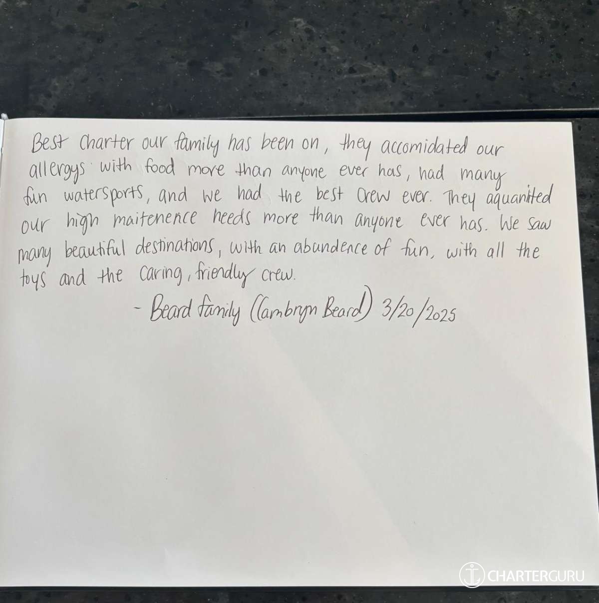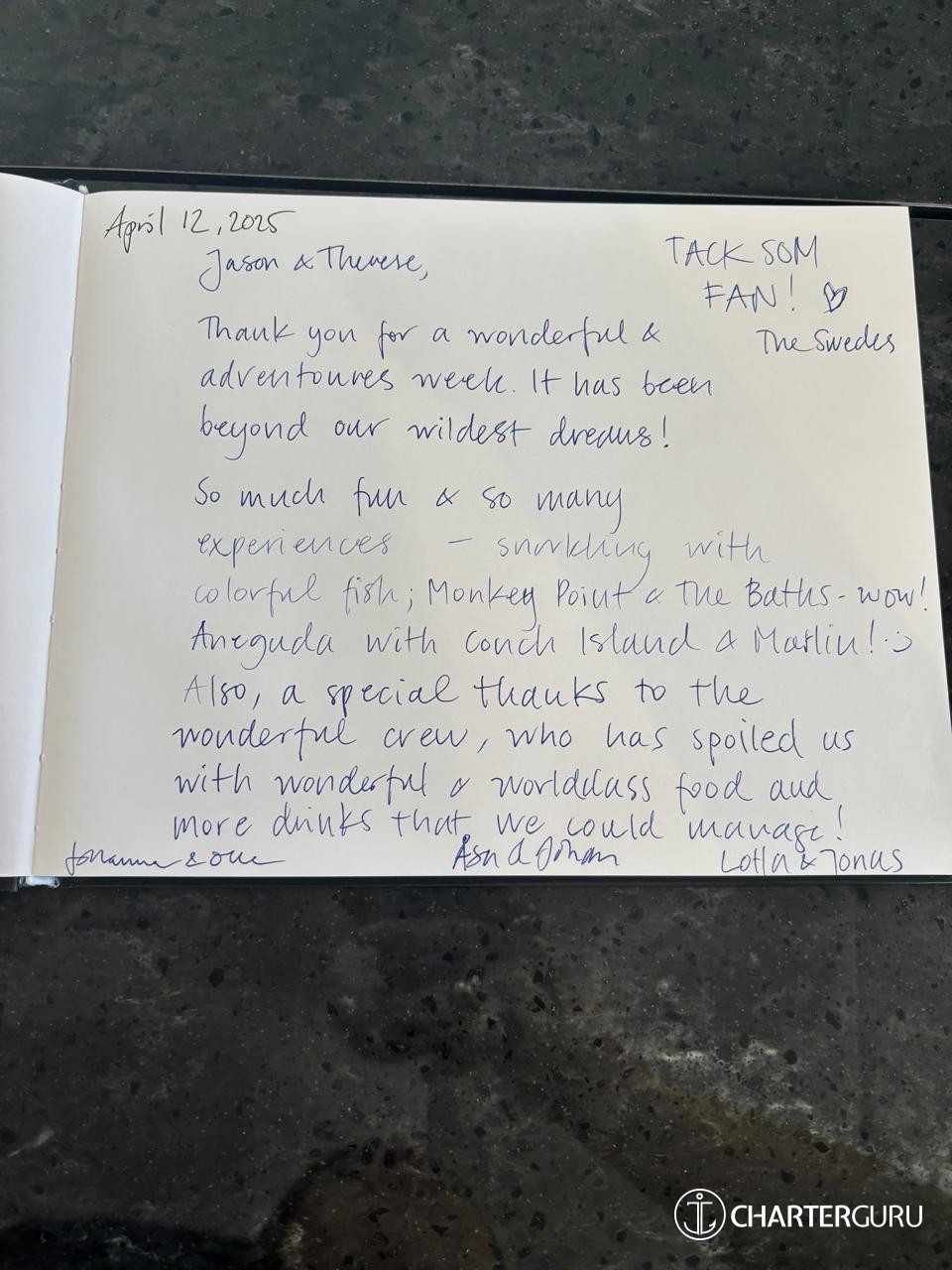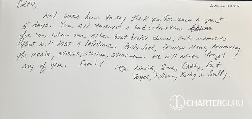 Not sure how to say thank you for such a great 5 days. You all turned a bad situation for us, when our other boat broke down, into memories that will last a lifetime. Billy Joel, Cornish Hens, snorkeling, the meals, stories, sunrise, sunsets... We will never forget any of you.