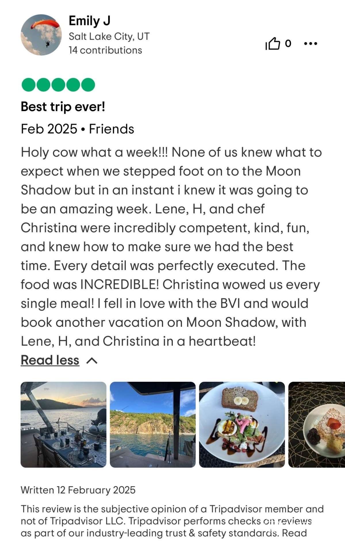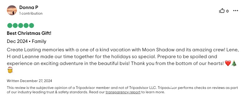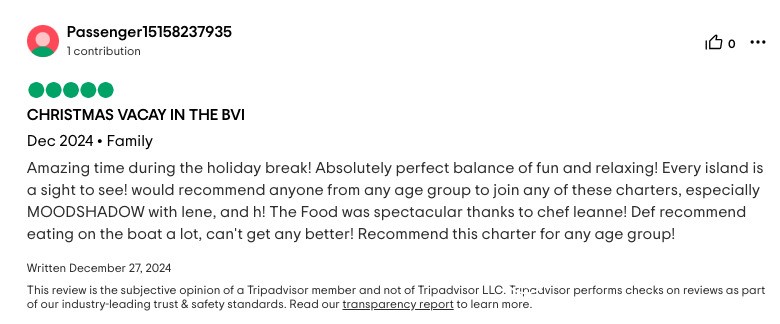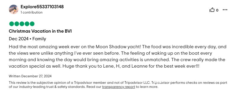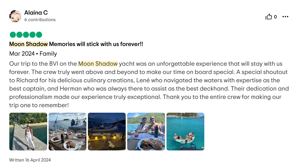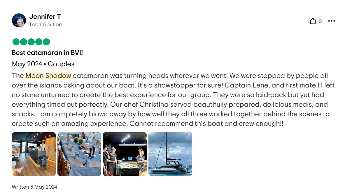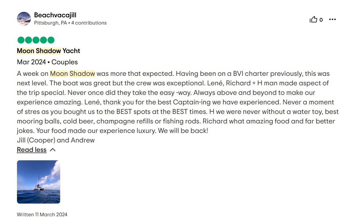 I cannot write high enough praise for the Moon Shadow and its crew, Captain Lene, Deckhand H, and Chef Richard. The experience was fabulous from the time we arrived in the islands and the service was white glove. Each excursion the crew planned was exactly what our group was looking for and their insider knowledge of the island made everything a breeze. The food was absolutely top-notch and you're lucky to be getting Chef Richard because he easily could be the head chef at a Michelin Star restaurant. If you are looking for the perfect getaway in the BVI, stop looking because you've found it aboard the Moon Shadow.
