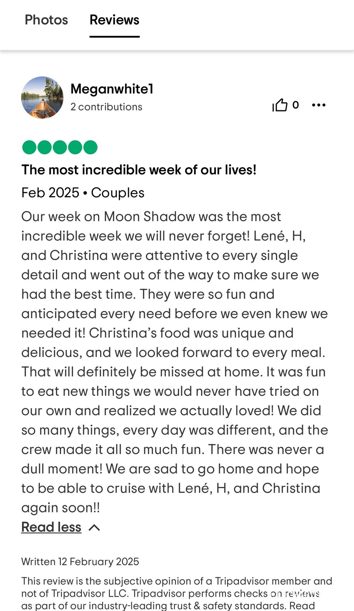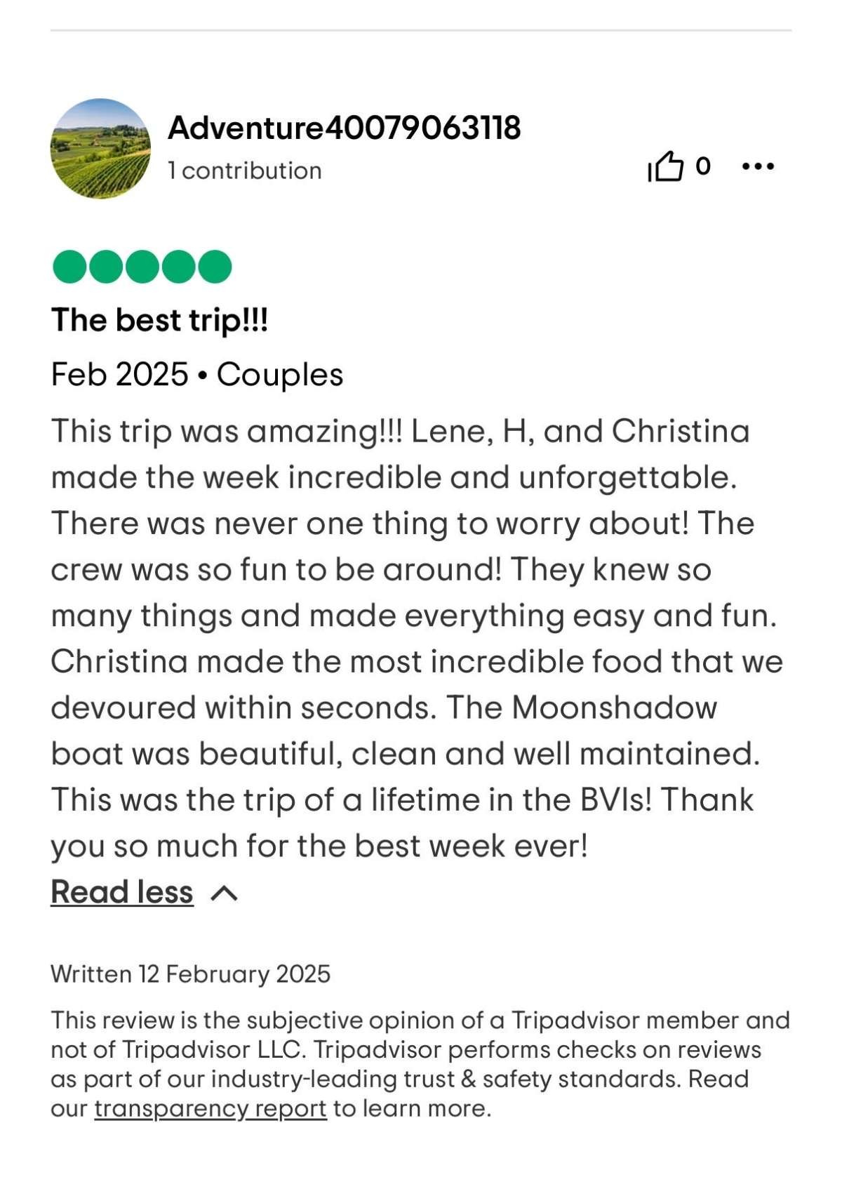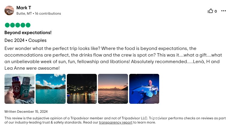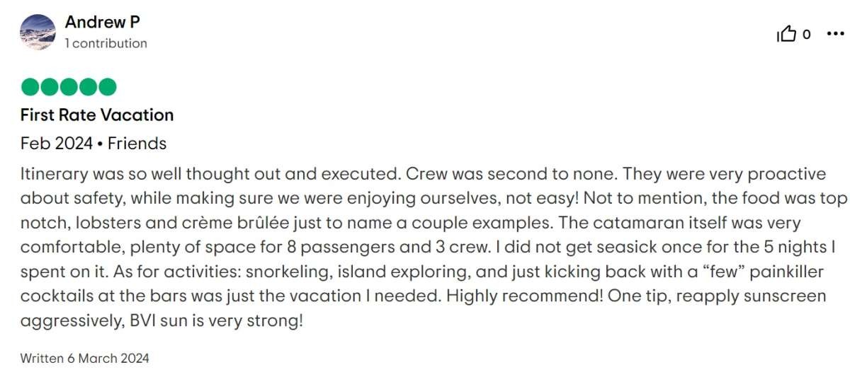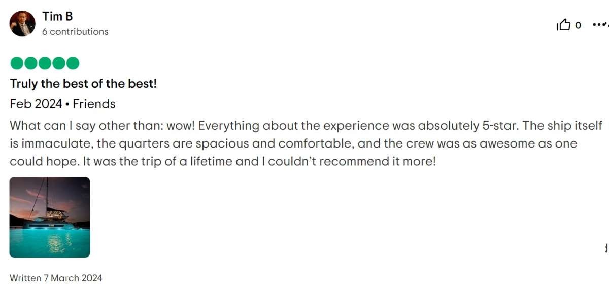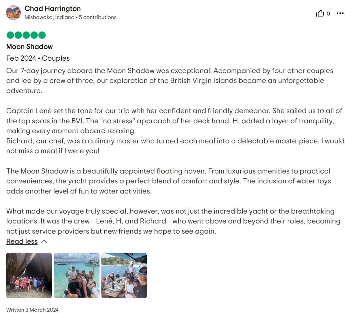 I cannot write high enough praise for the Moon Shadow and its crew, Captain Lene, Deckhand H, and Chef Richard. The experience was fabulous from the time we arrived in the islands and the service was white glove. Each excursion the crew planned was exactly what our group was looking for and their insider knowledge of the island made everything a breeze. The food was absolutely top-notch and you're lucky to be getting Chef Richard because he easily could be the head chef at a Michelin Star restaurant. If you are looking for the perfect getaway in the BVI, stop looking because you've found it aboard the Moon Shadow.