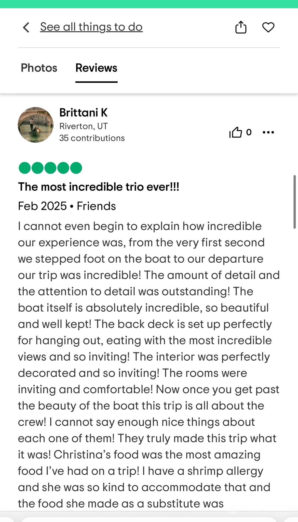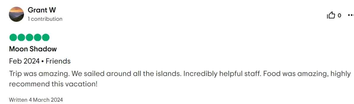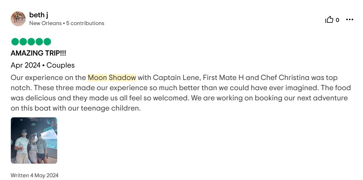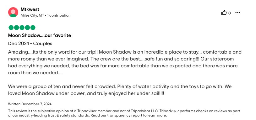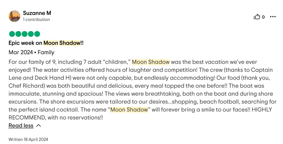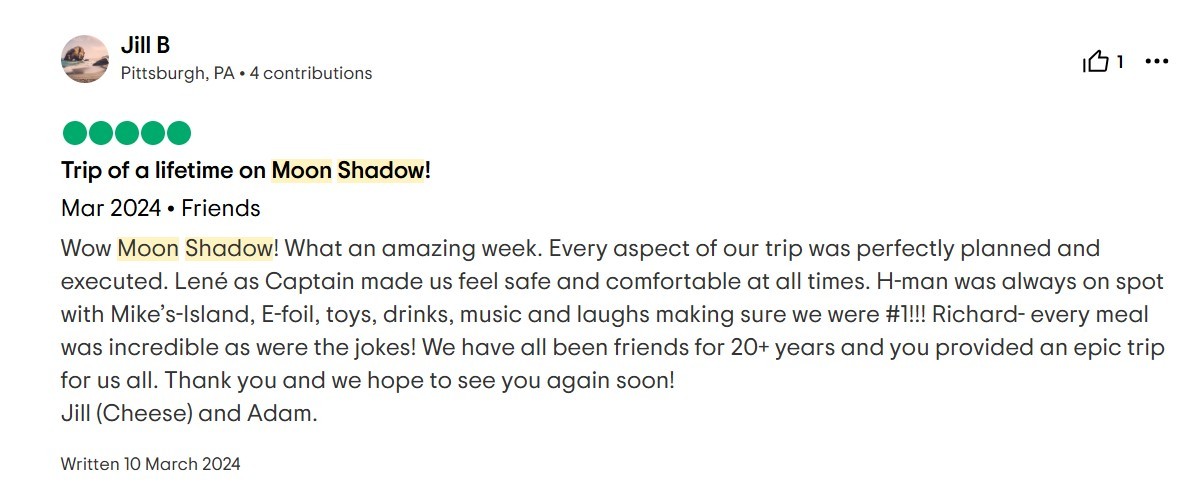 For our family of 9, including 7 adult “children,” Moon Shadow was the best vacation we’ve ever enjoyed! The water activities offered hours of laughter and competition! The crew (thanks to Captain Lene and Deck Hand H) were not only capable, but endlessly accommodating! Our food (thank you, Chef Richard) was both beautiful and delicious, every meal topped the one before!! The boat was immaculate, stunning and spacious! The views were breathtaking, both on the boat and during shore excursions. The shore excursions were tailored to our desires…shopping, beach football, searching for the perfect island cocktail. The name “Moon Shadow” will forever bring a smile to our faces!! HIGHLY RECOMMEND, with no reservations!!
