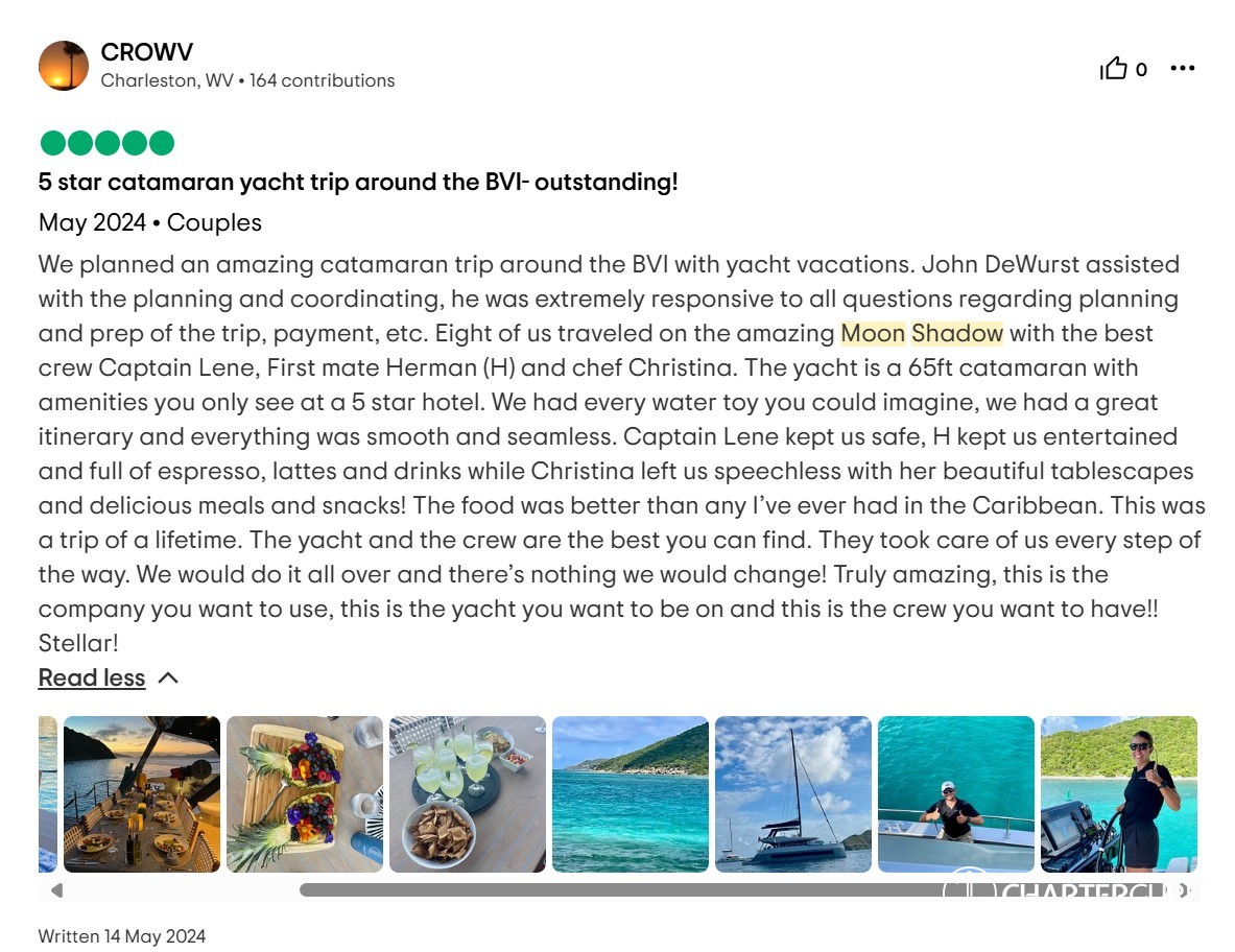 We planned an amazing catamaran trip around the BVI with yacht vacations. John DeWurst assisted with the planning and coordinating, he was extremely responsive to all questions regarding planning and prep of the trip, payment, etc. Eight of us traveled on the amazing Moon Shadow with the best crew Captain Lene, First mate Herman (H) and chef Christina. The yacht is a 65ft catamaran with amenities you only see at a 5 star hotel. We had every water toy you could imagine, we had a great itinerary and everything was smooth and seamless. Captain Lene kept us safe, H kept us entertained and full of espresso, lattes and drinks while Christina left us speechless with her beautiful tablescapes and delicious meals and snacks! The food was better than any I’ve ever had in the Caribbean. This was a trip of a lifetime. The yacht and the crew are the best you can find. They took care of us every step of the way. We would do it all over and there’s nothing we would change! Truly amazing, this is the company you want to use, this is the yacht you want to be on and this is the crew you want to have!! Stellar!